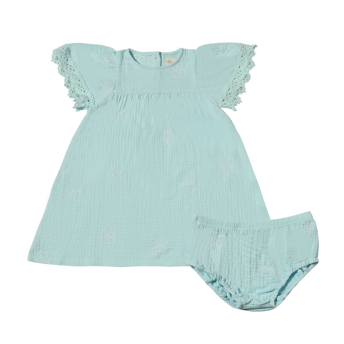 The airy silhouette is ideal for spring and summer outings, while the dreamy aqua color adds a fresh pop to any wardrobe. Comes with coordinating bloomers for baby sizes only.