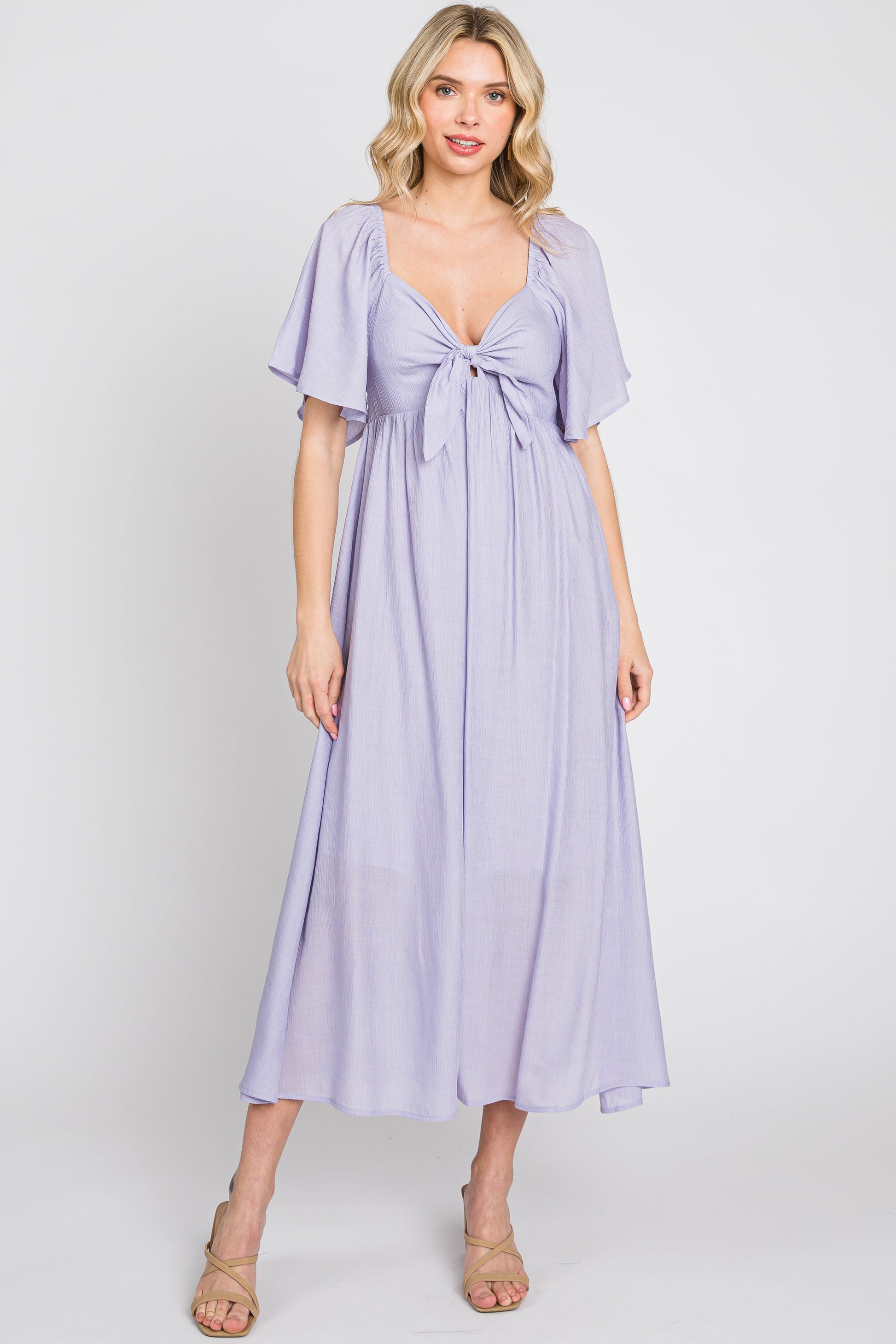 Lavender Front Tie Ruffle Sleeve Midi Dress