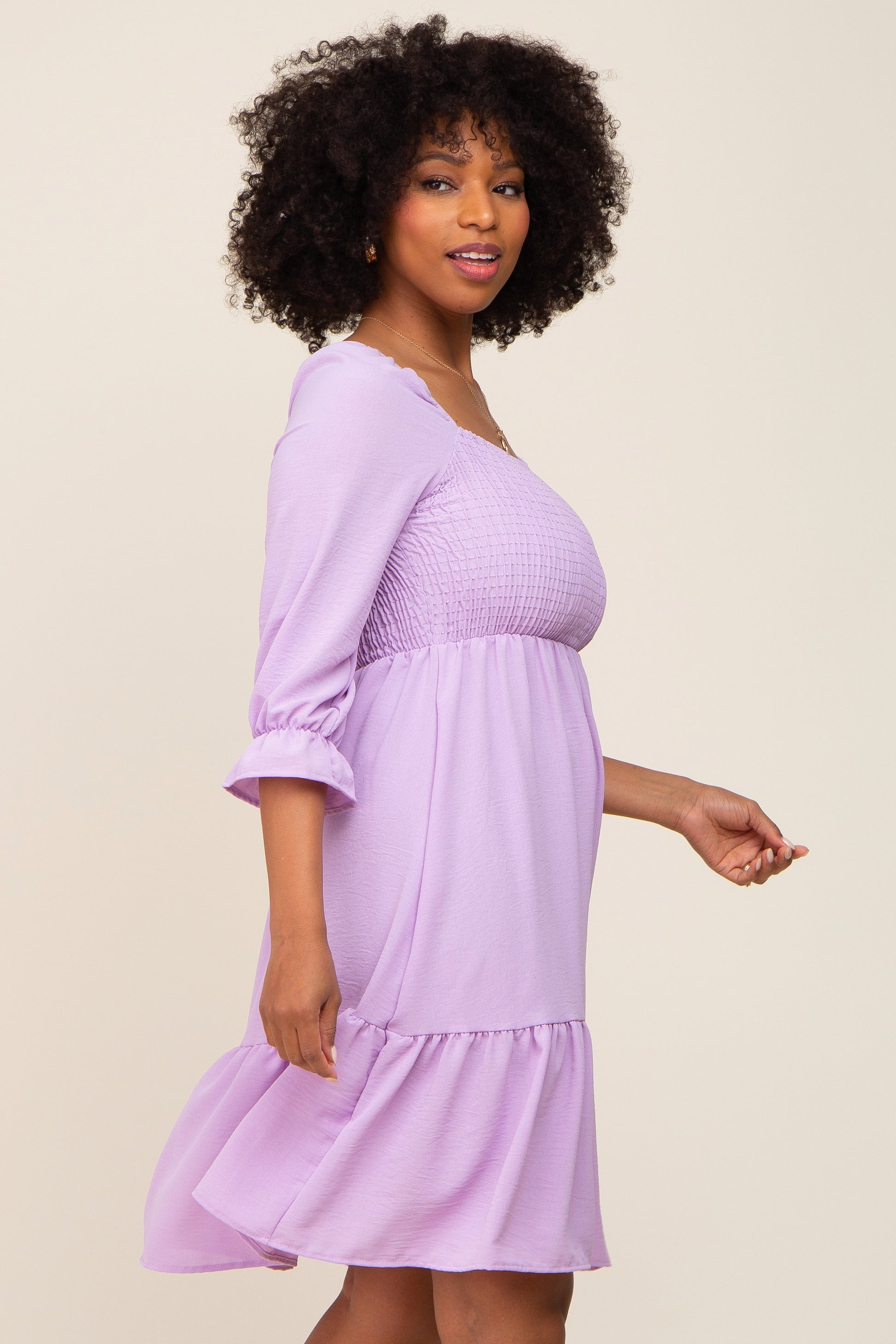 A solid dress featuring a smocked top, 3/4 ruffle sleeves, a ruffle hem and a square neckline.