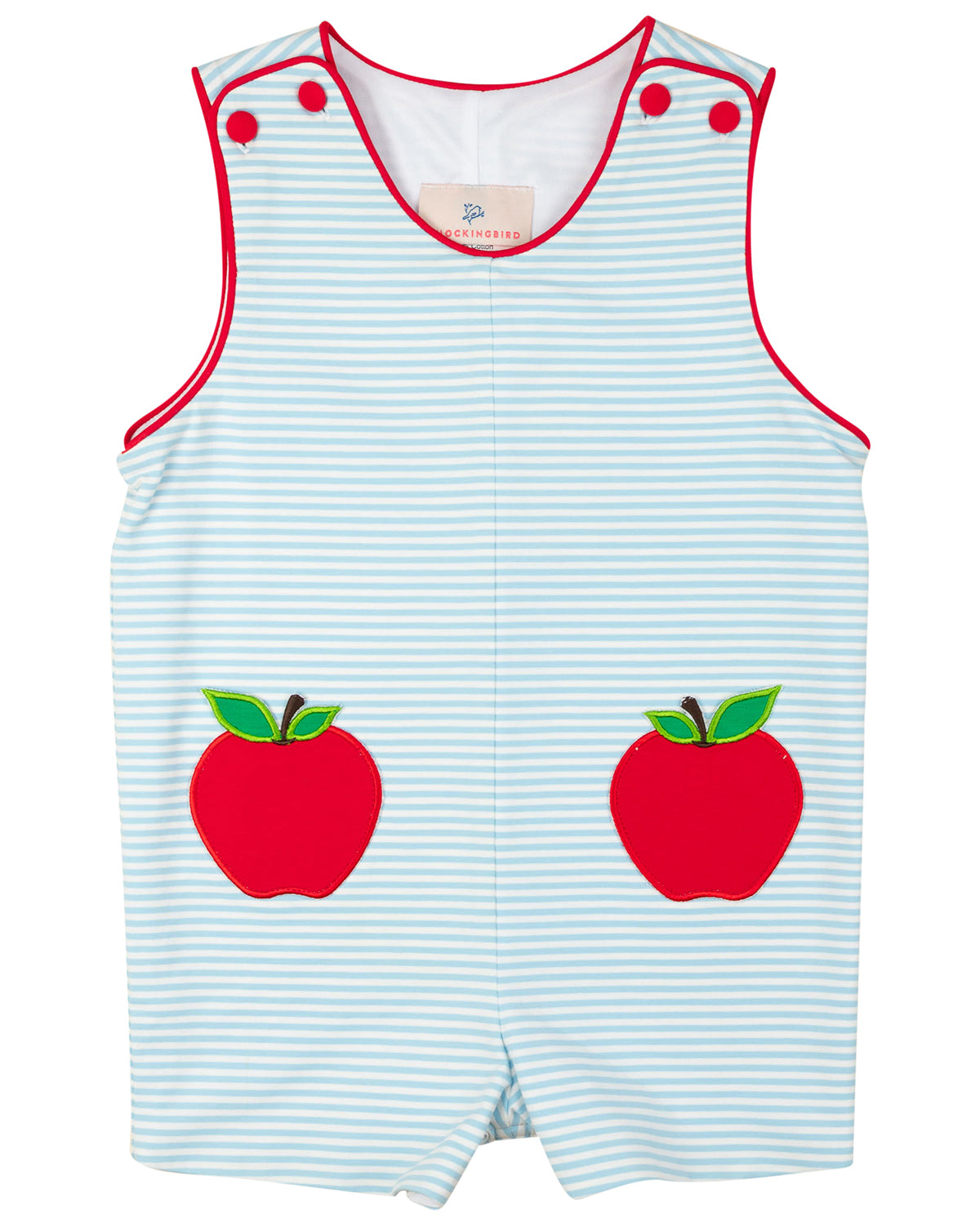 Smart style meets playful comfort in the Light Blue Apple Pocket Knit Shortall! With classic light blue stripes, sweet apple appliqué pockets, and practical button closures, this one-piece shortall is the perfect outfit for school-time adventures or weekend fun.