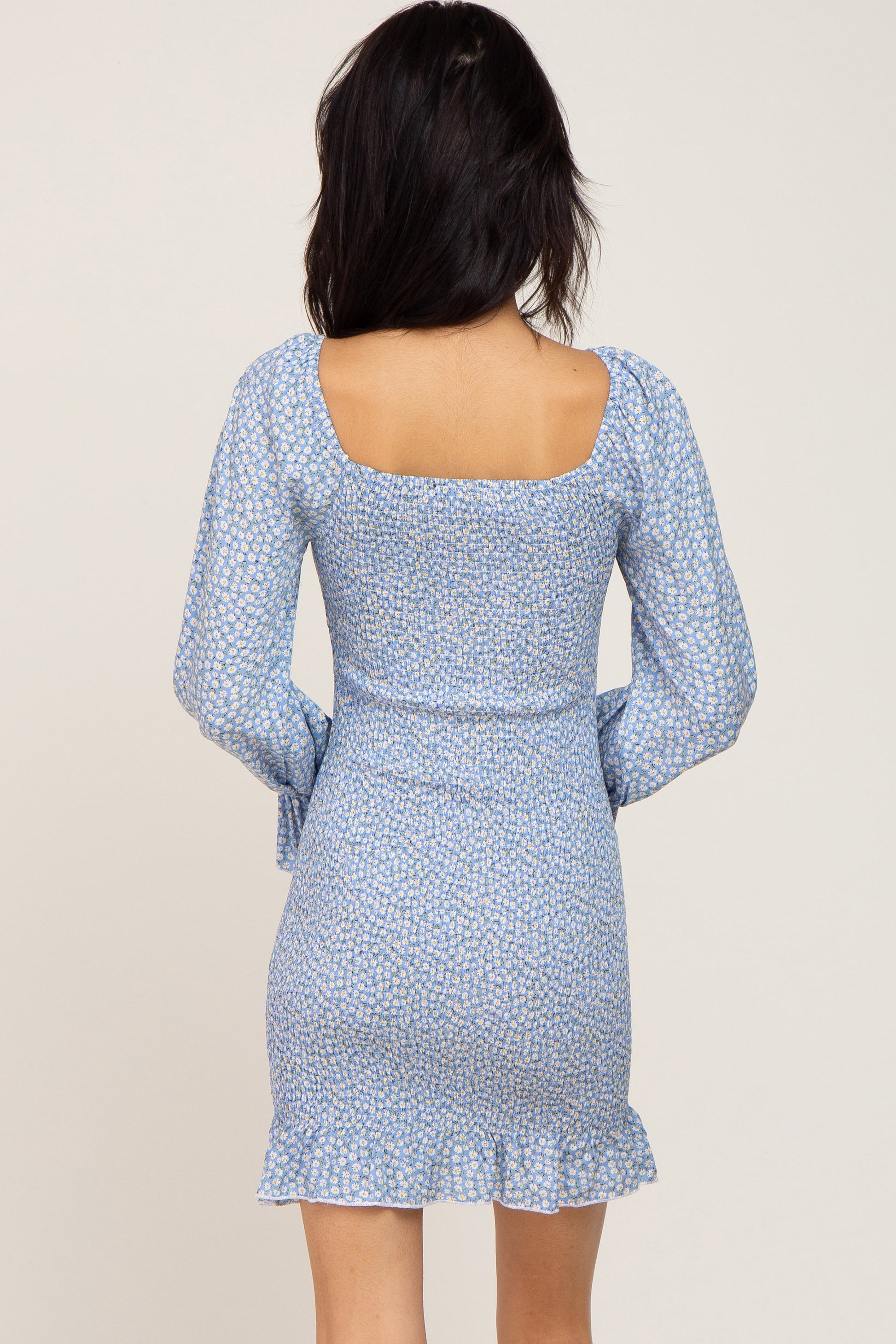 Light Blue Ditsy Floral Smocked Long Sleeve Mini Dress