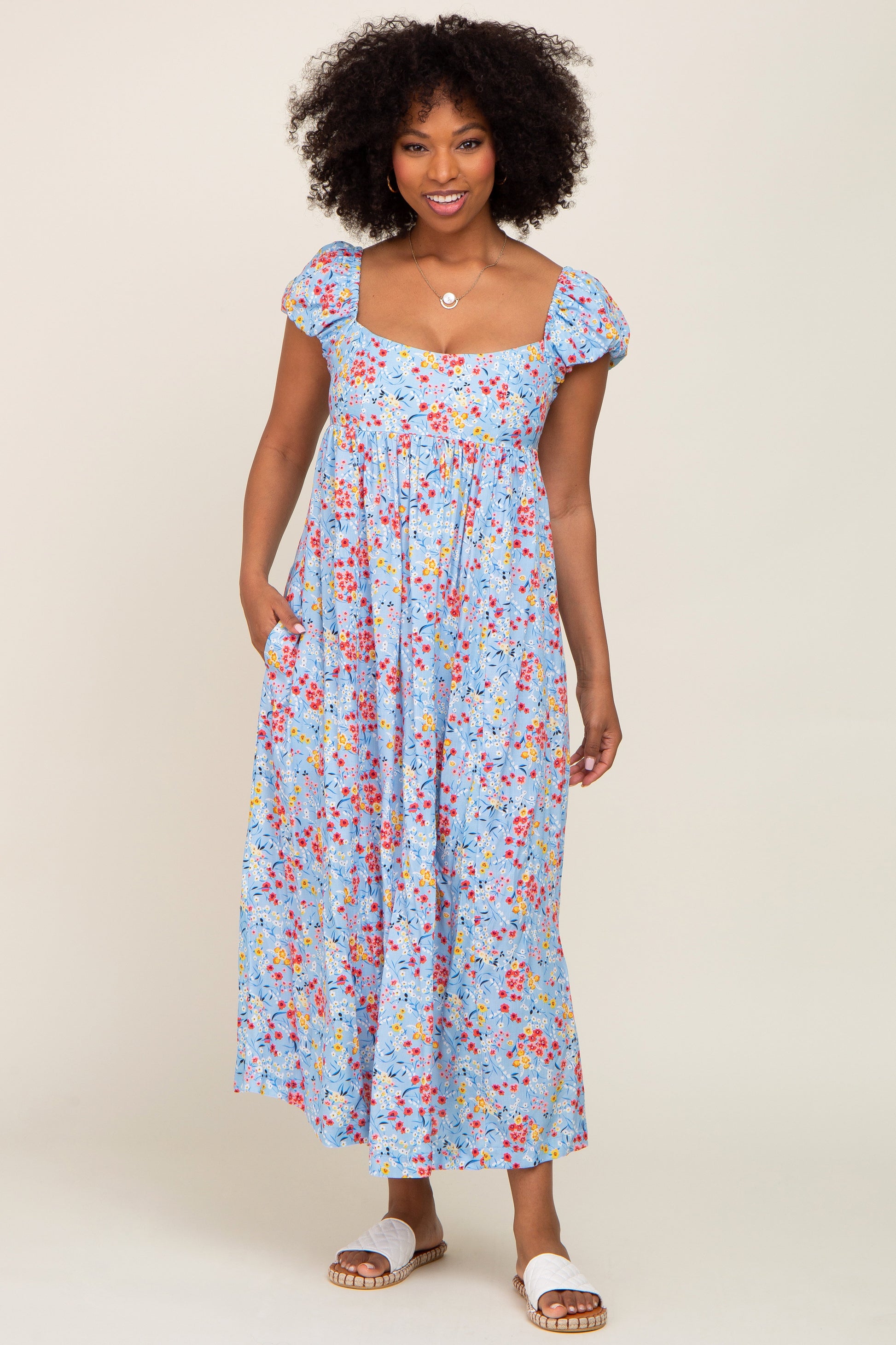 A floral midi dress featuring a squared neckline, shirt cap sleeves, side pockets, a lined bust, a back cutout with a tie, an elastic back waist, and a hi-lo hem. May be worn backwards.