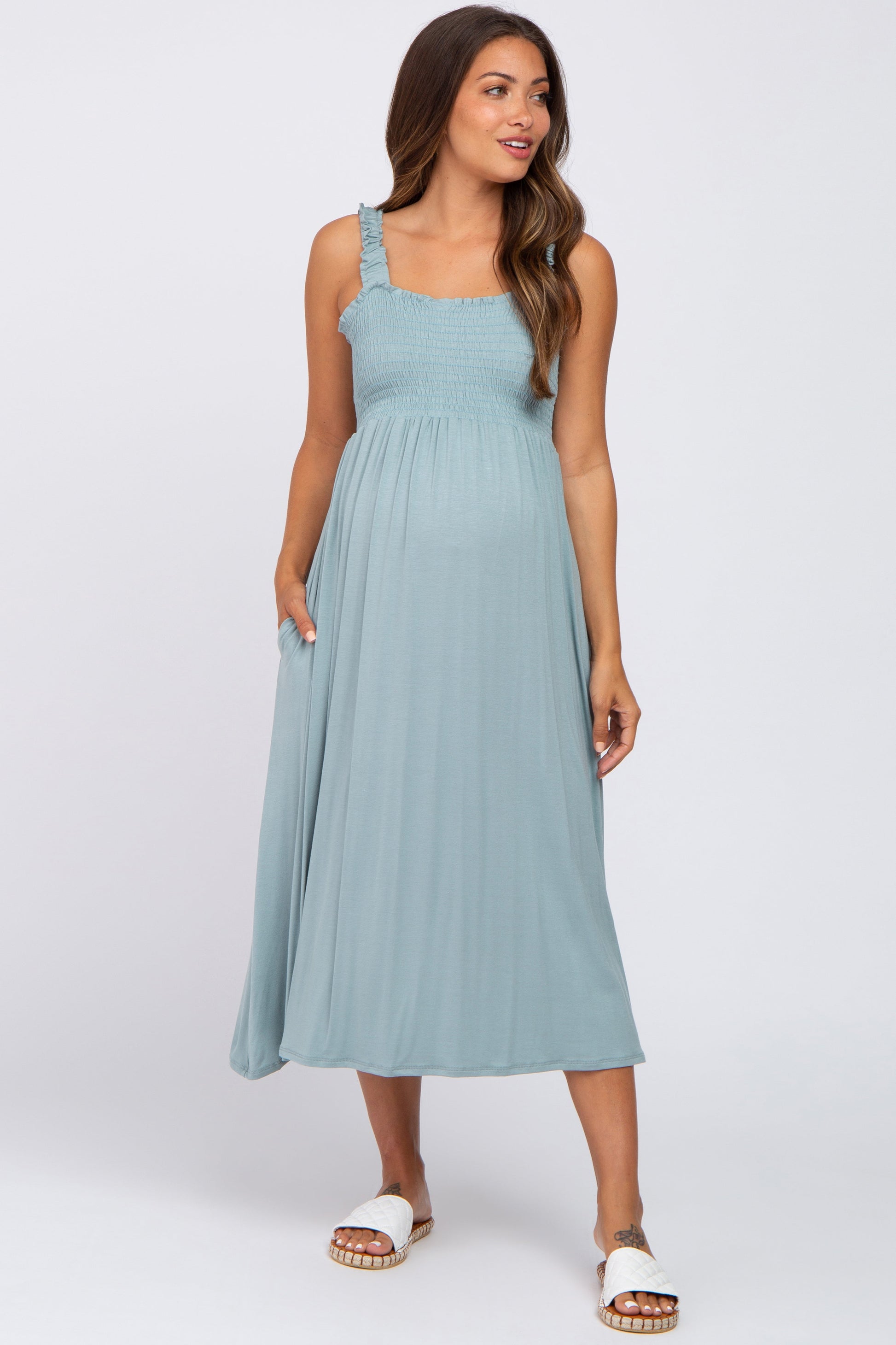Light Blue Smocked Ruffle Strap Maternity Midi Dress