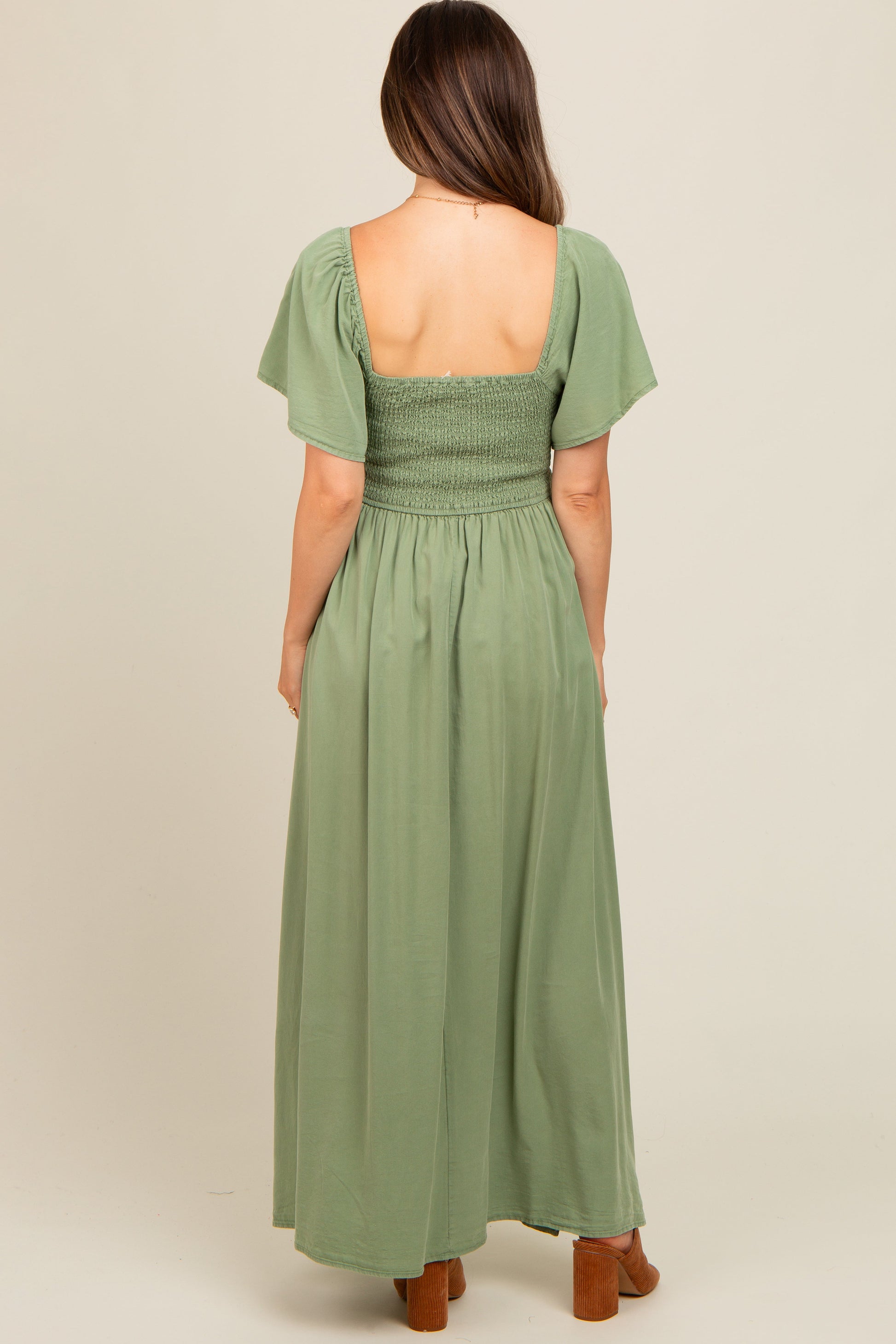 Embrace comfort and style with this Light Olive Chambray Smocked Maternity Maxi Dress. Crafted from soft, breathable fabric, it features a smocked bodice for a flattering fit that adapts to your growing bump. The square neckline and flutter sleeves add a feminine touch, while the flowing maxi skirt offers ease of movement and a relaxed silhouette. Perfect for casual outings or special occasions, this dress combines elegance with everyday wearability. Side slits enhance comfort and style, making it a versatile addition to your maternity wardrobe. Easy to dress up or down, this maxi dress is maternity wear you’ll love throughout your pregnancy.