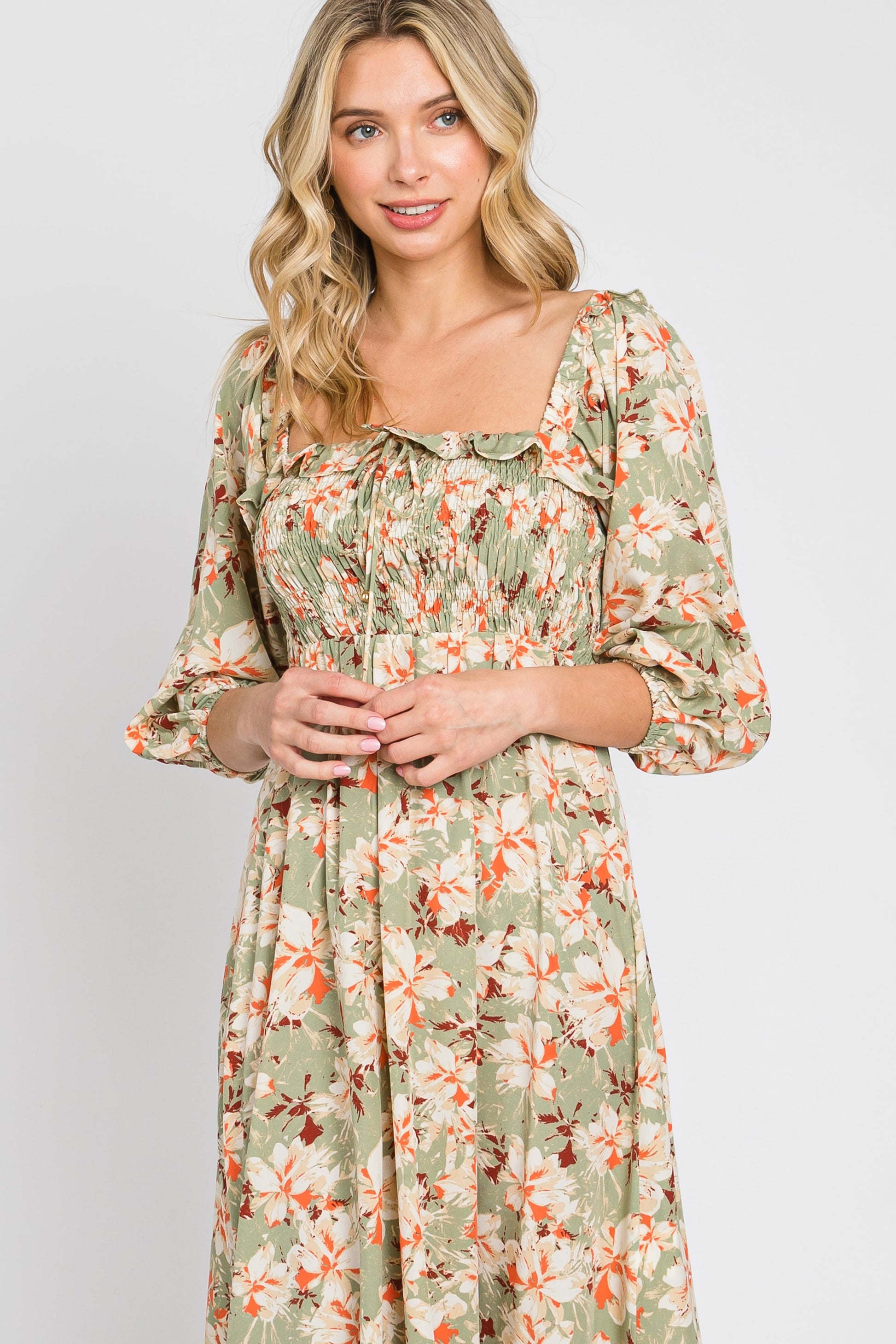 Light Olive Floral Ruffle Square Neck Smocked Front Tie Midi Dress