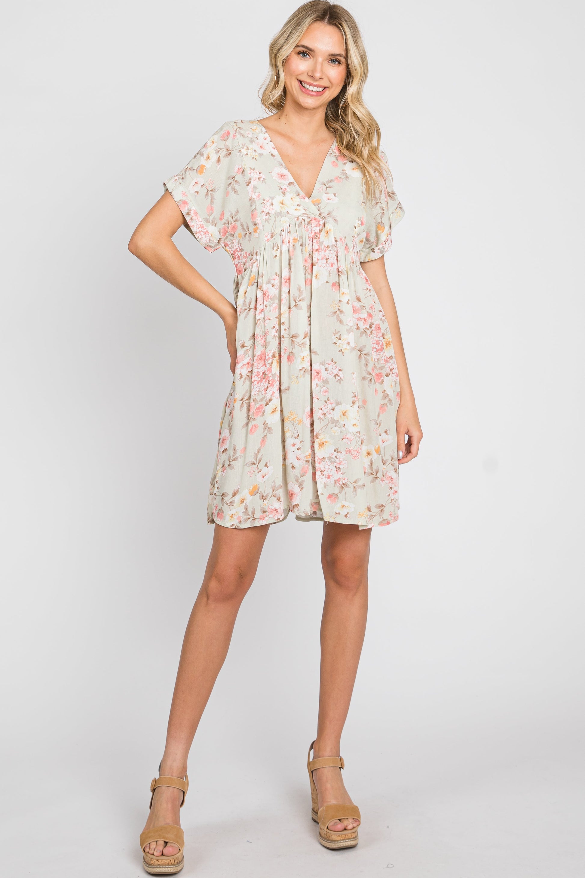 A floral print dress featuring a v-neckline, short dolman cuffed sleeves and an adjustable tie at the back.