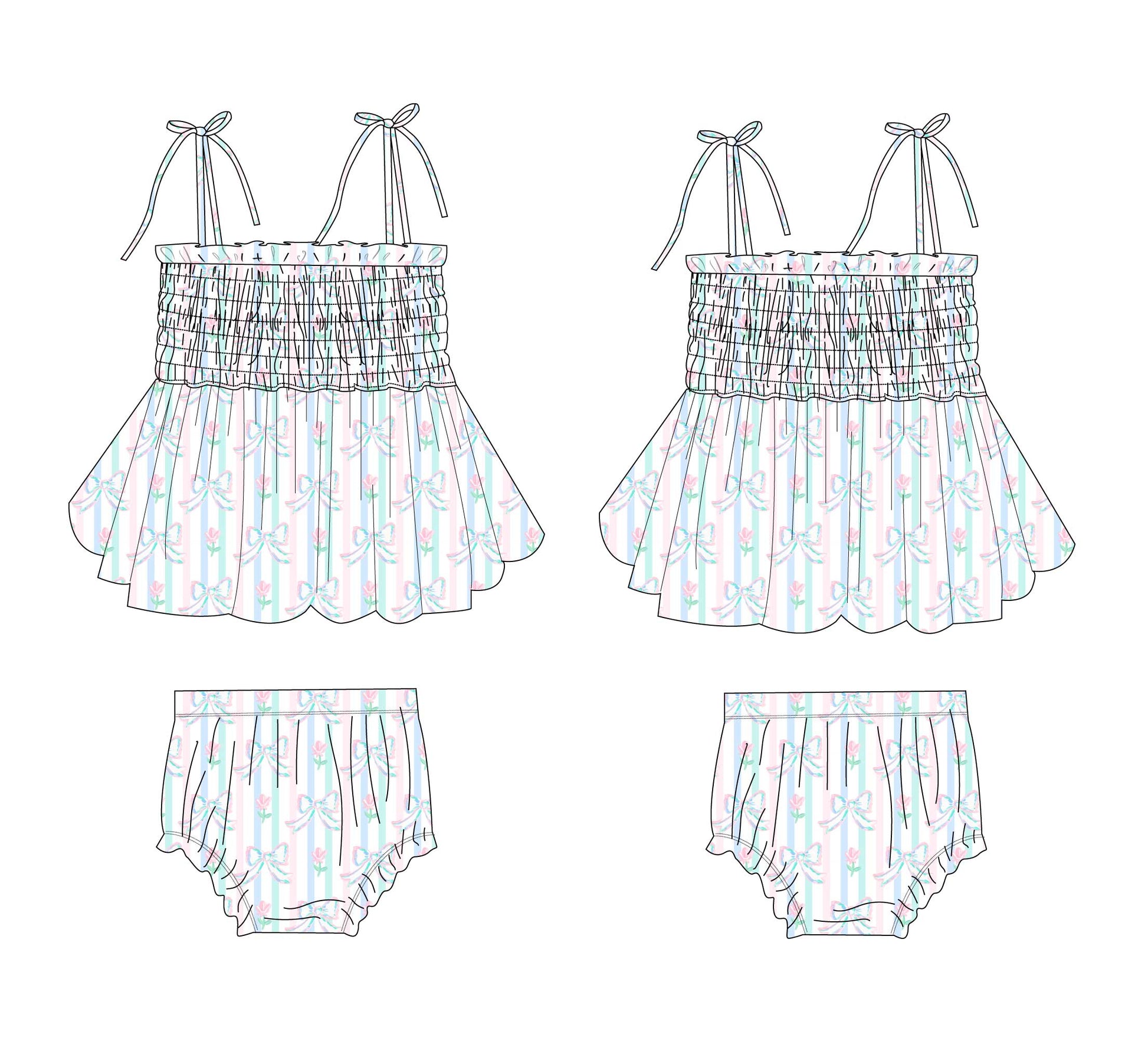 Introducing our smocked diaper cover dress — a classic piece designed to grow with your little one. Crafted from the finest buttery soft bamboo, this darling set features an elegantly smocked dress with adjustable tie sleeves, paired with a matching diaper cover for a complete, polished look.