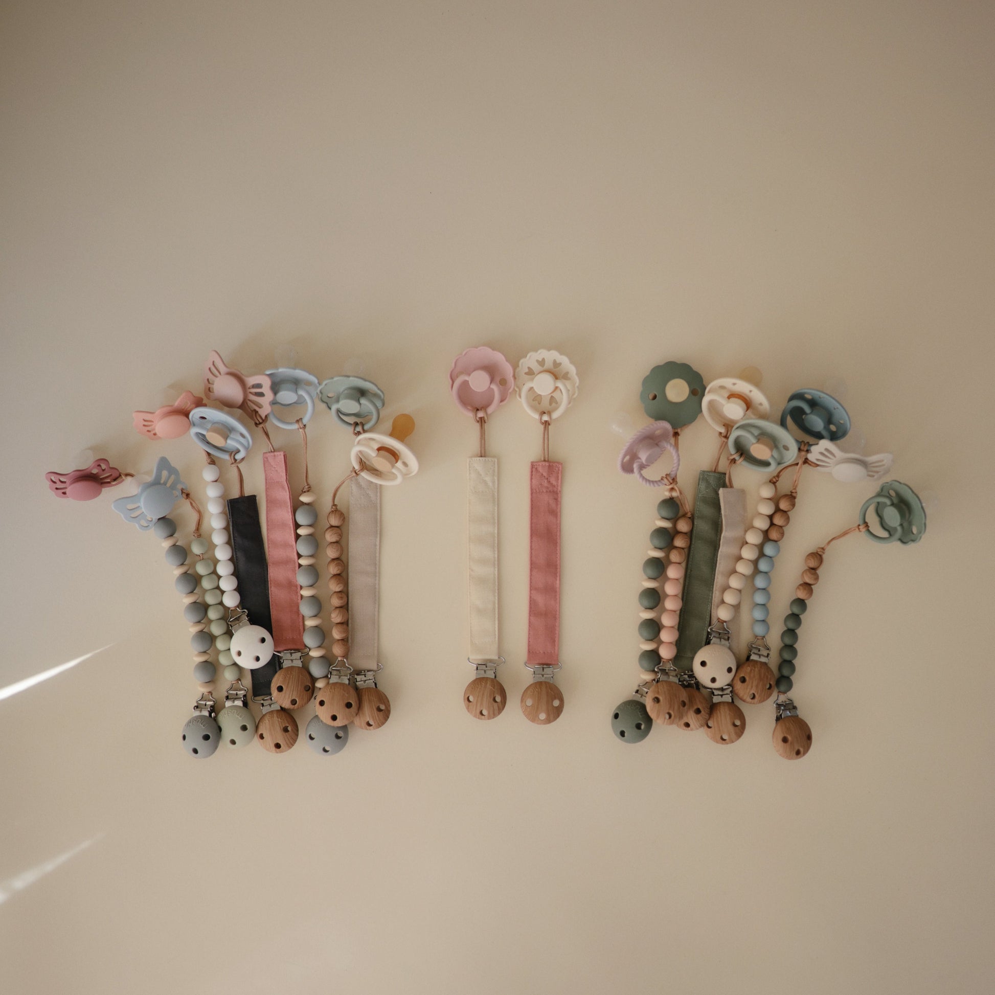Keep soothing favorites near little hands with our two-pack linen pacifier clip. With an interior water resistant coating, this material can easily withstand daily use and messy moments. Its fabric is soft to the touch while the faux wood silicone clasp holds secure to keep pacifiers in reach and off the floor. The loop design is compatible with most pacifiers as the clip offers durability and long-lasting features to families on-the-go.
