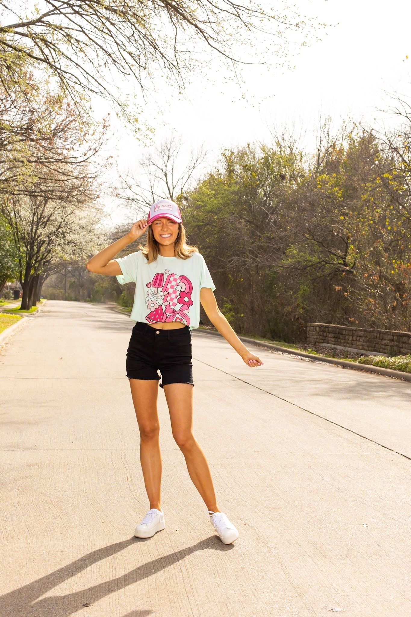Grace and Emma's Black Distressed Denim Shorts, a versatile addition to your wardrobe. Crafted for both style and comfort, these shorts feature stretchy denim that moves with you. Available in classic black, crisp white, and soft light pink, there's a color for every mood and outfit. Whether you're dressing up or keeping it casual, these shorts are sure to become a staple piece in your closet.
