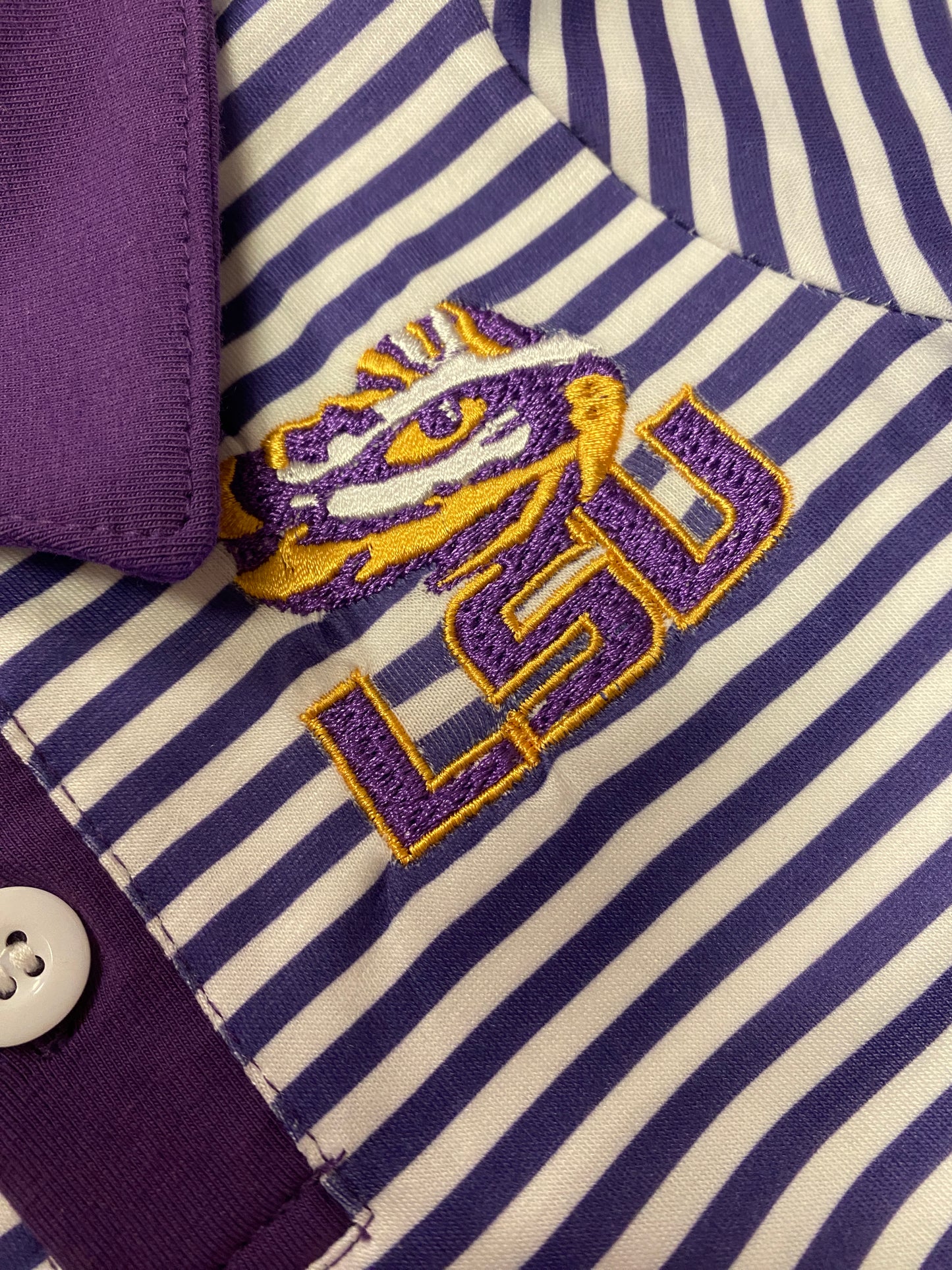 Take your game day outfit to the next level with this purple stripe LSU Tigers embroidered button down shirt. Cheer on your team in style while staying cool and comfortable. Perfect for any Tigers fan, this shirt is a must-have for any game day event. (Geaux Tigers!)