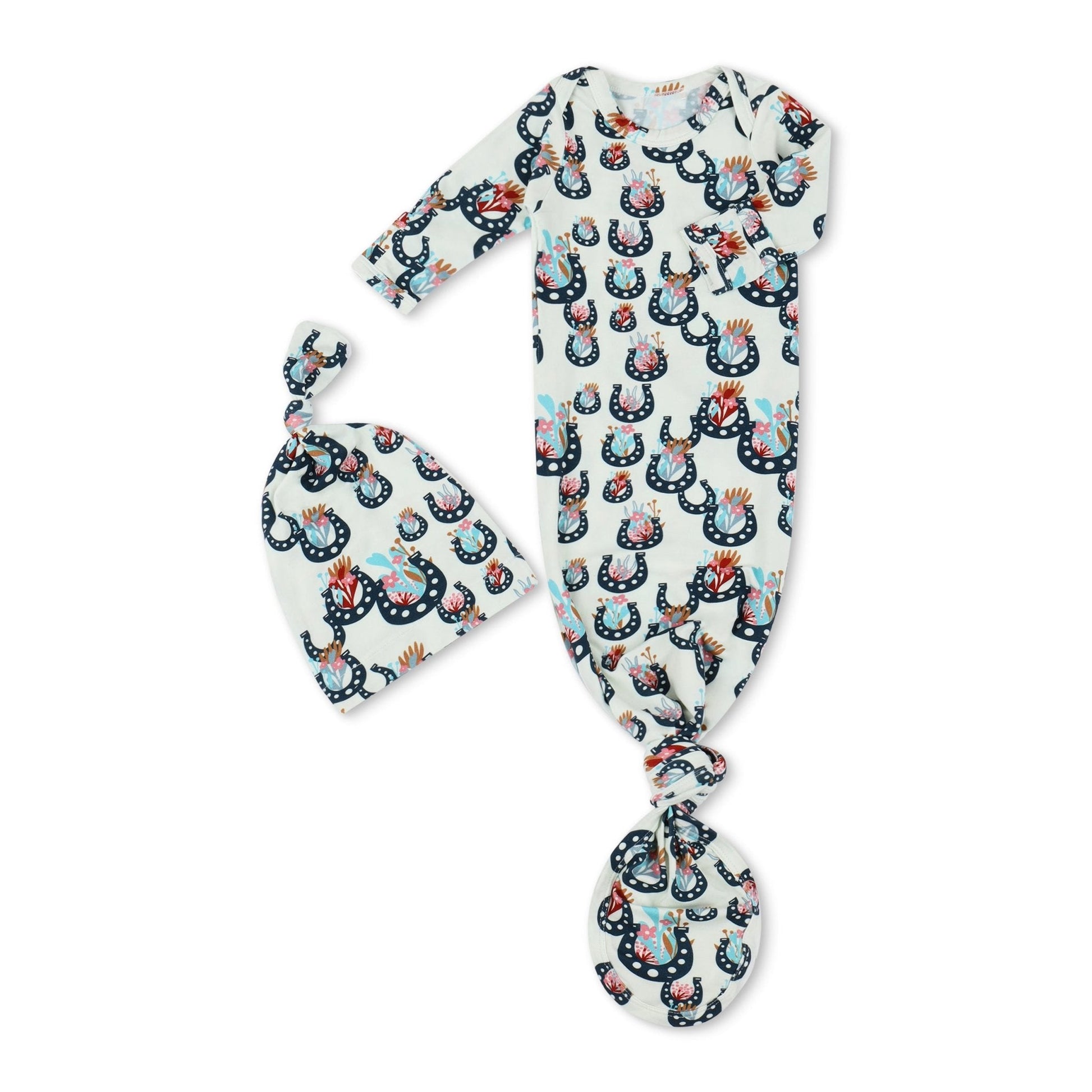 This Lucky Blossoms Gown & Hat is perfect for your littlest (or luckiest!) one! Its knot gown and soft bamboo fabric provide comfort and convenience, while its printed floral and horseshoe design keeps them looking oh-so-cute. Plus, fold over hand mittens protect them from scratches! A lucky find!