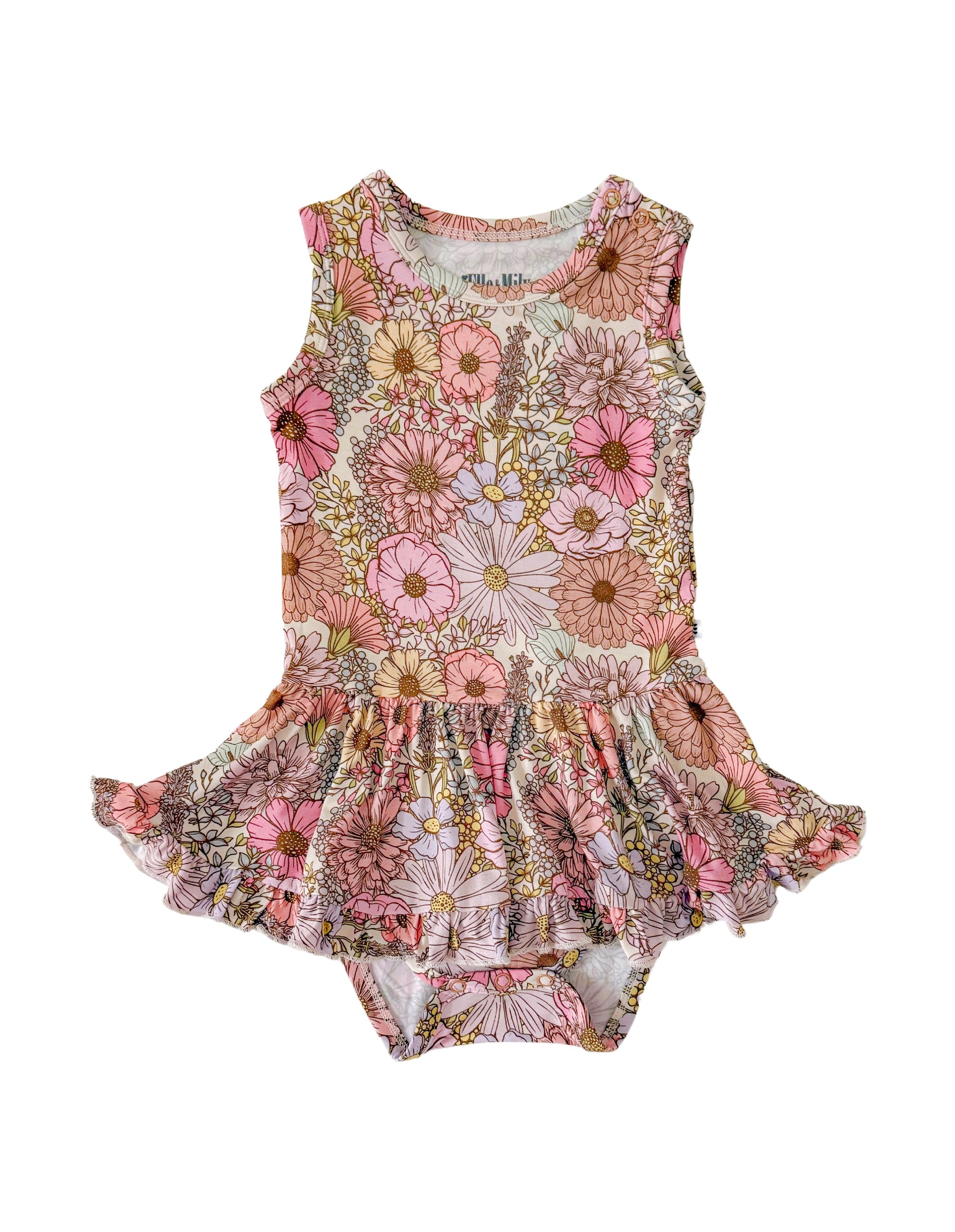 Introducing the Mae Bamboo Skirted Bodysuit - the playful, twirl-worthy dress for your little girl's wardrobe. Made with soft and comfy bamboo, this spring floral bodysuit dress is as cute as it is comfortable. Perfect for any occasion, it's the must-have addition for your little fashionista!