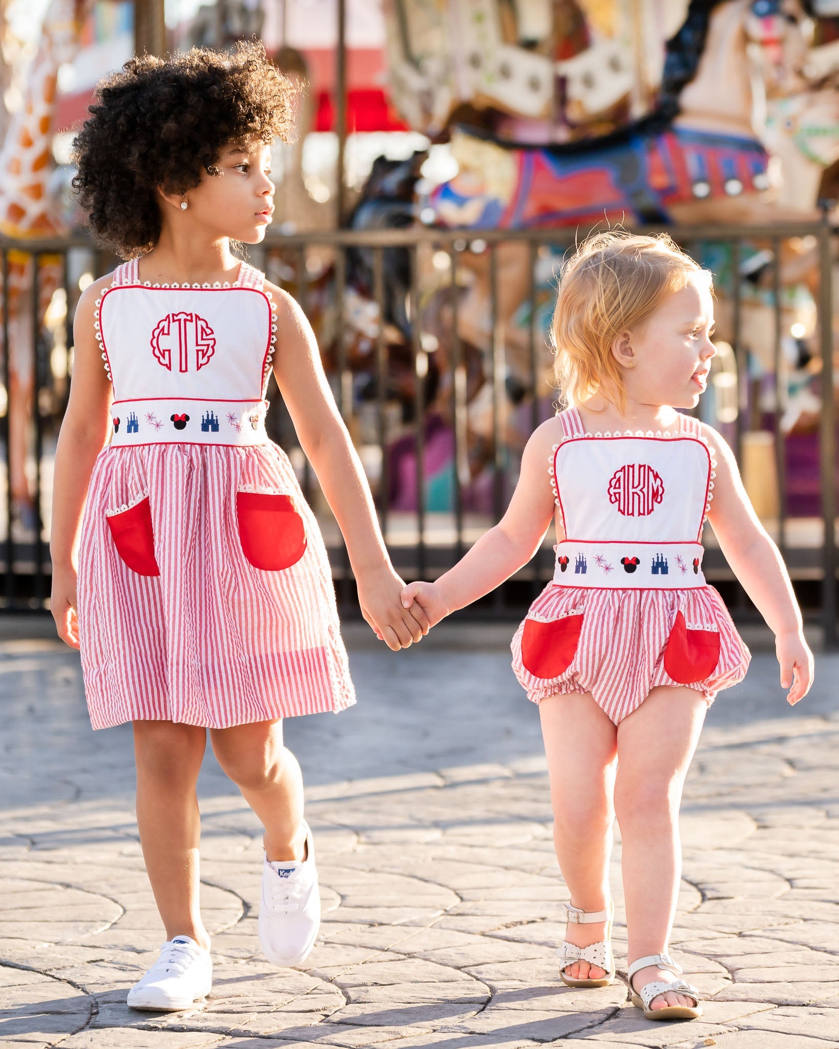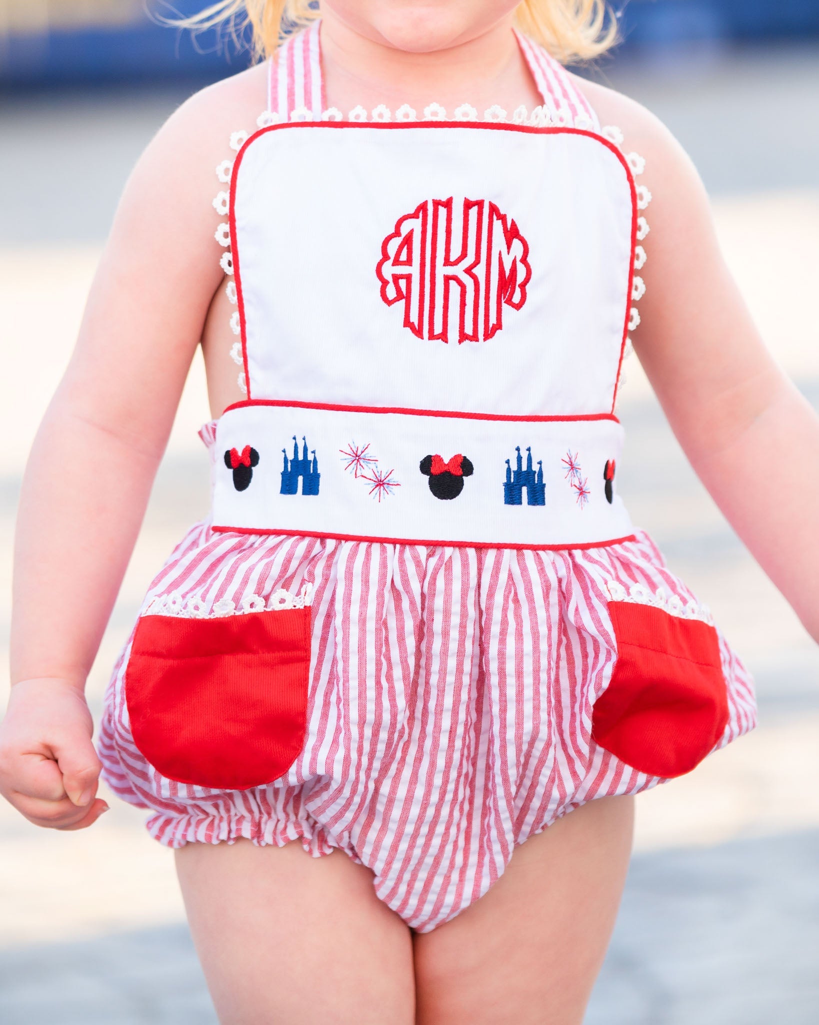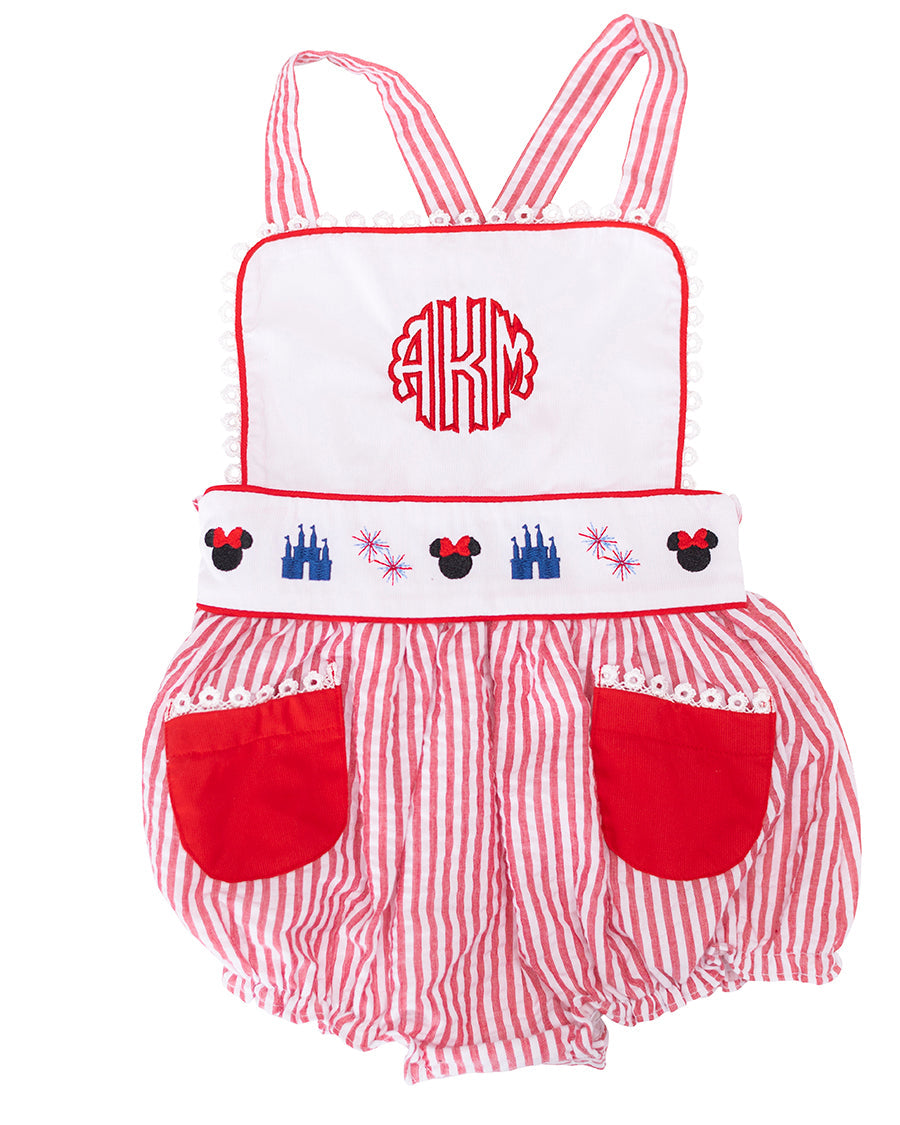 Perfect for your next trip to the Parks! Our Magical Mouse Red Seersucker Sun Bubble features embroidery at the waist, criss cross adjustable straps, red pockets on the front and a red bow in the back that ties it all together. Add a monogram or name for that personal touch. 100% cotton.