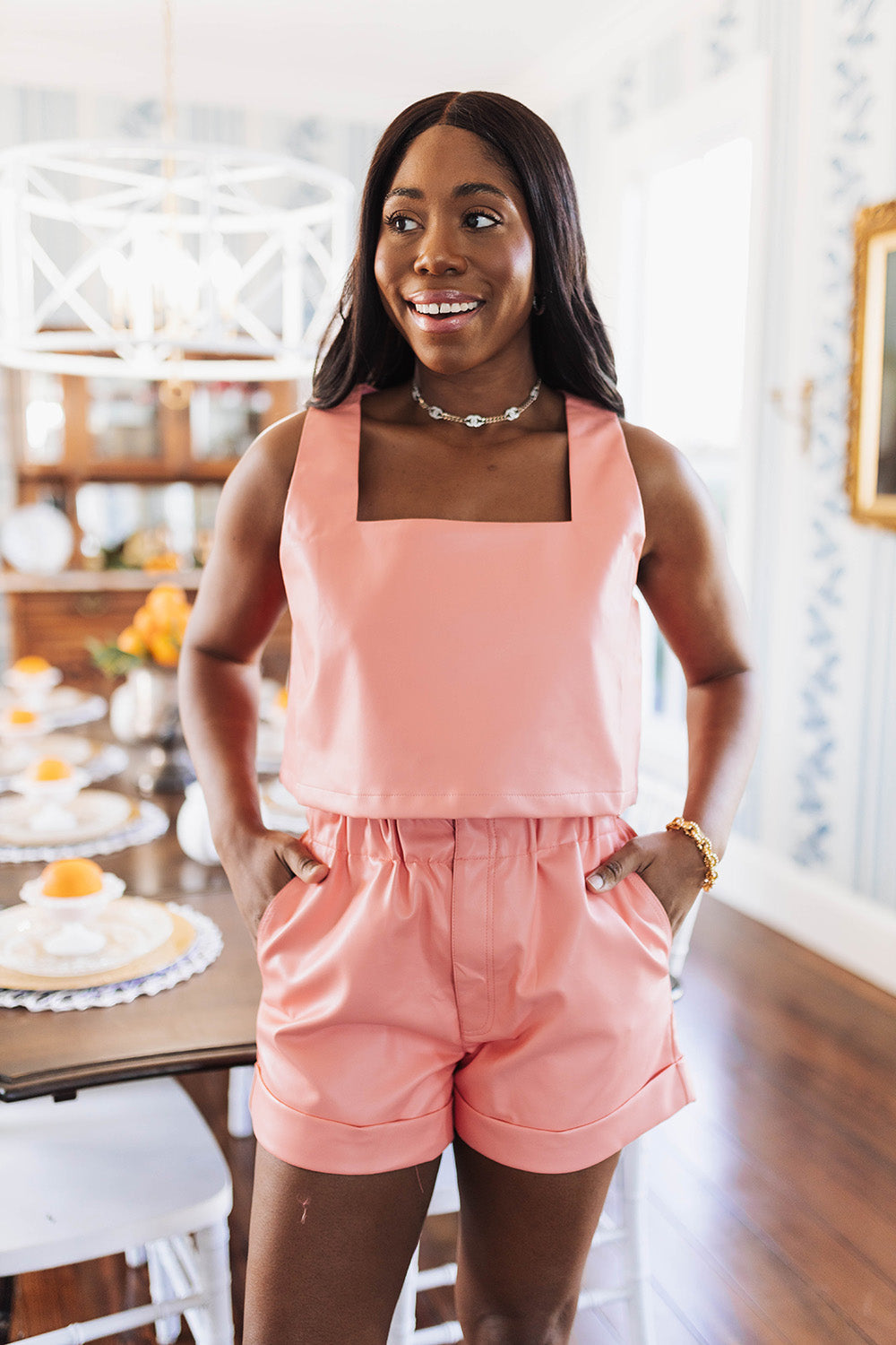 We think everyone needs a good leather top in their closet! The Manning Top features a boxy cropped fit and wide tank top straps.This faux leather cropped tank can be worn on its own, but also pairs perfectly with our Peyton Shorts!