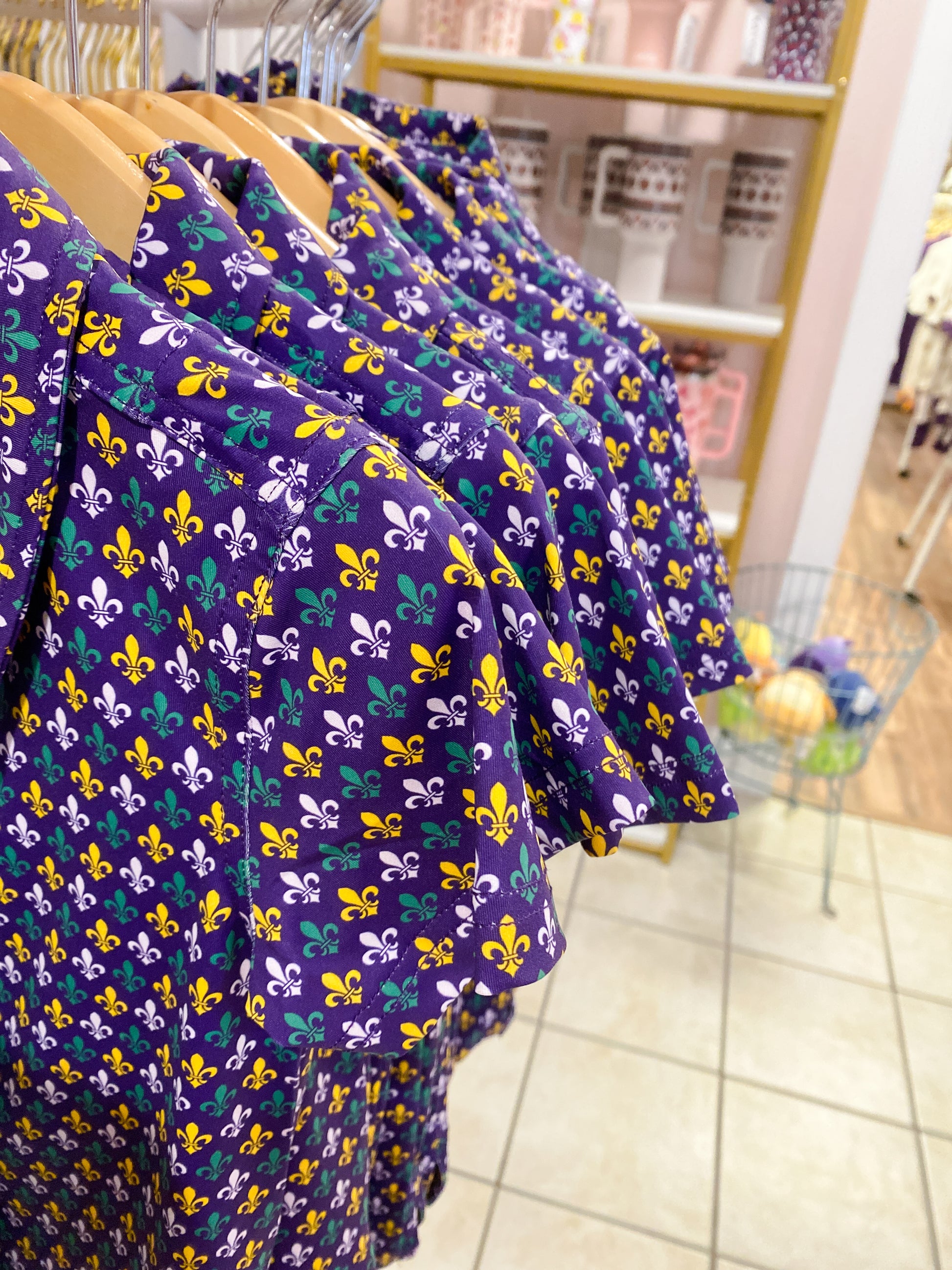 Celebrate Carnival season in classic Louisiana style with our Boys Mardi Gras Fleur-de-Lis Performance Polo. Featuring an all-over purple, green, and gold fleur-de-lis print, this polo is a timeless Mardi Gras staple that feels festive yet polished.