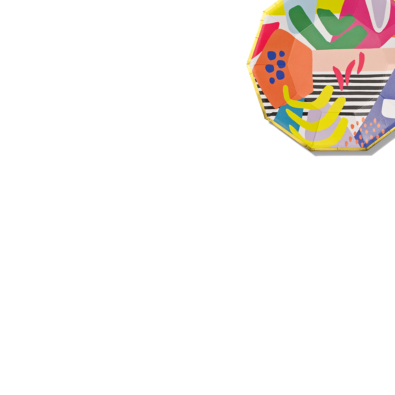 Our petite Matisse Small Plates are an elevated solution for everything from passed hors d'oeuvres to slices of birthday cake. Featuring our exclusive colorful graphic and a tasteful geometric shape, these paper plates are a work of art unto themselves.