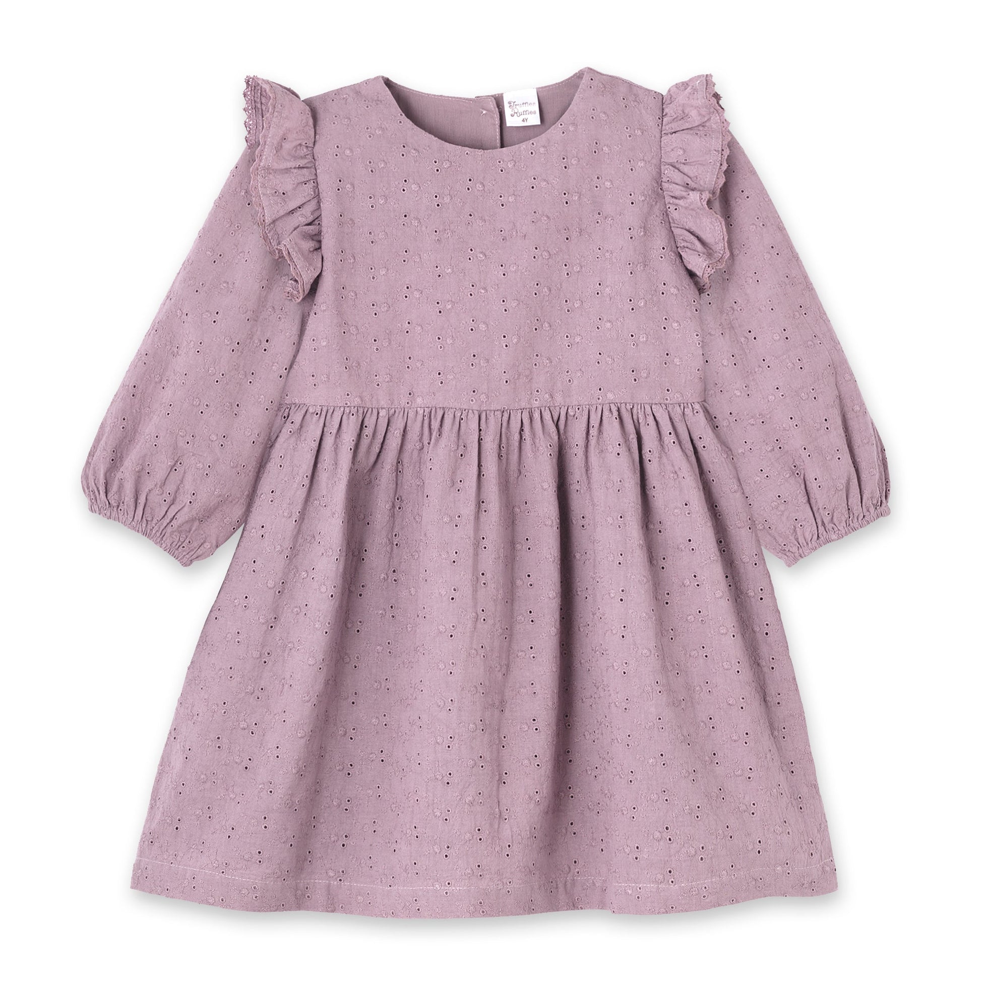 This charming girls' dress features a soft mauve hue with an all-over eyelet pattern, adding delicate texture and timeless appeal. Shoulder ruffles and puffed sleeves with elastic cuffs create a sweet, feminine silhouette. Designed with back buttons and a sash for the perfect fit, it’s ideal for special occasions or everyday grace. From Truffles Ruffles Capsule Collection featuring exquisite styles for girls 0-6.