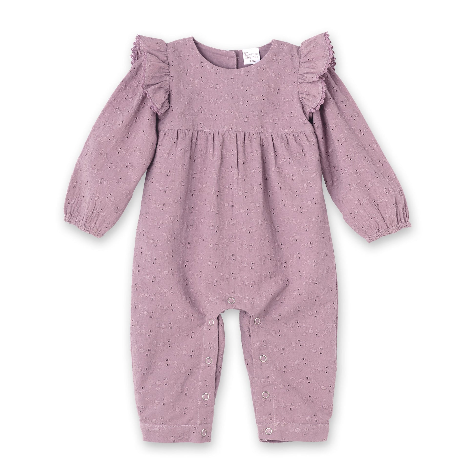 Mauve Eyelet Girls Romper – Embroidered Cotton Ruffle Sleeve