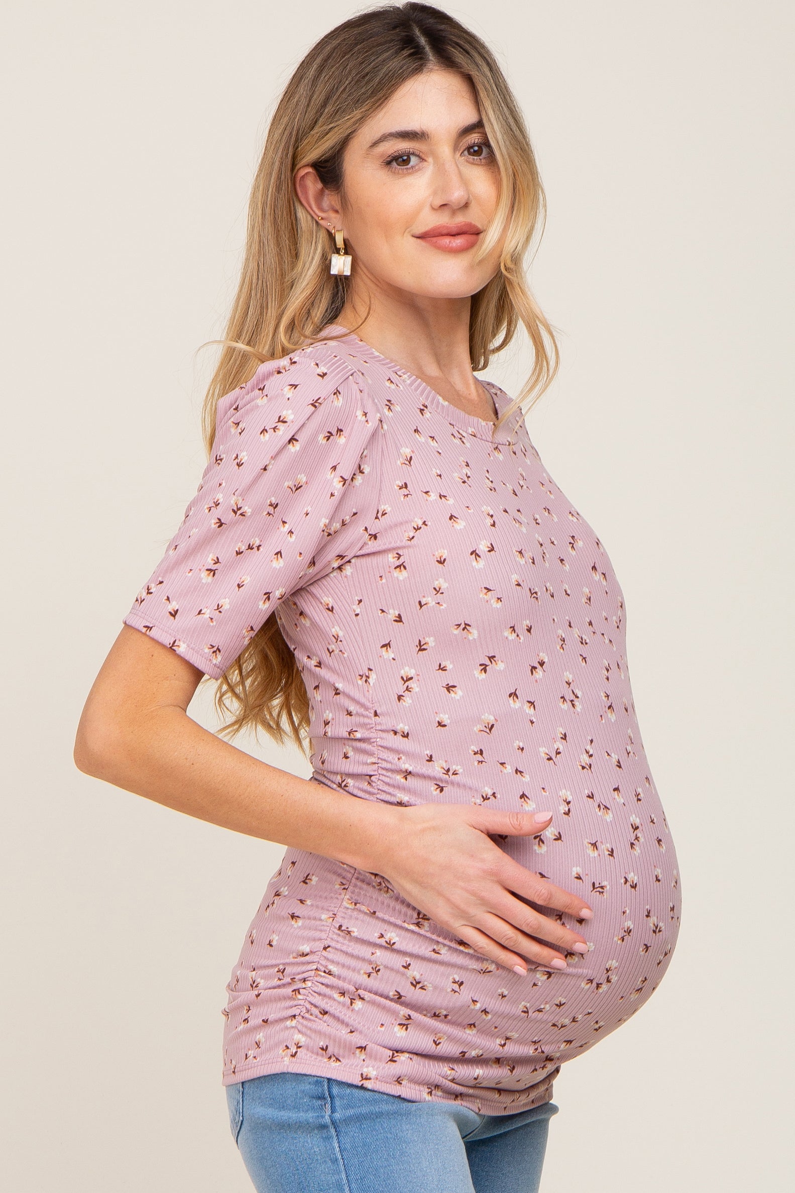 Mauve Floral Side Ruched Maternity Short Sleeve Top