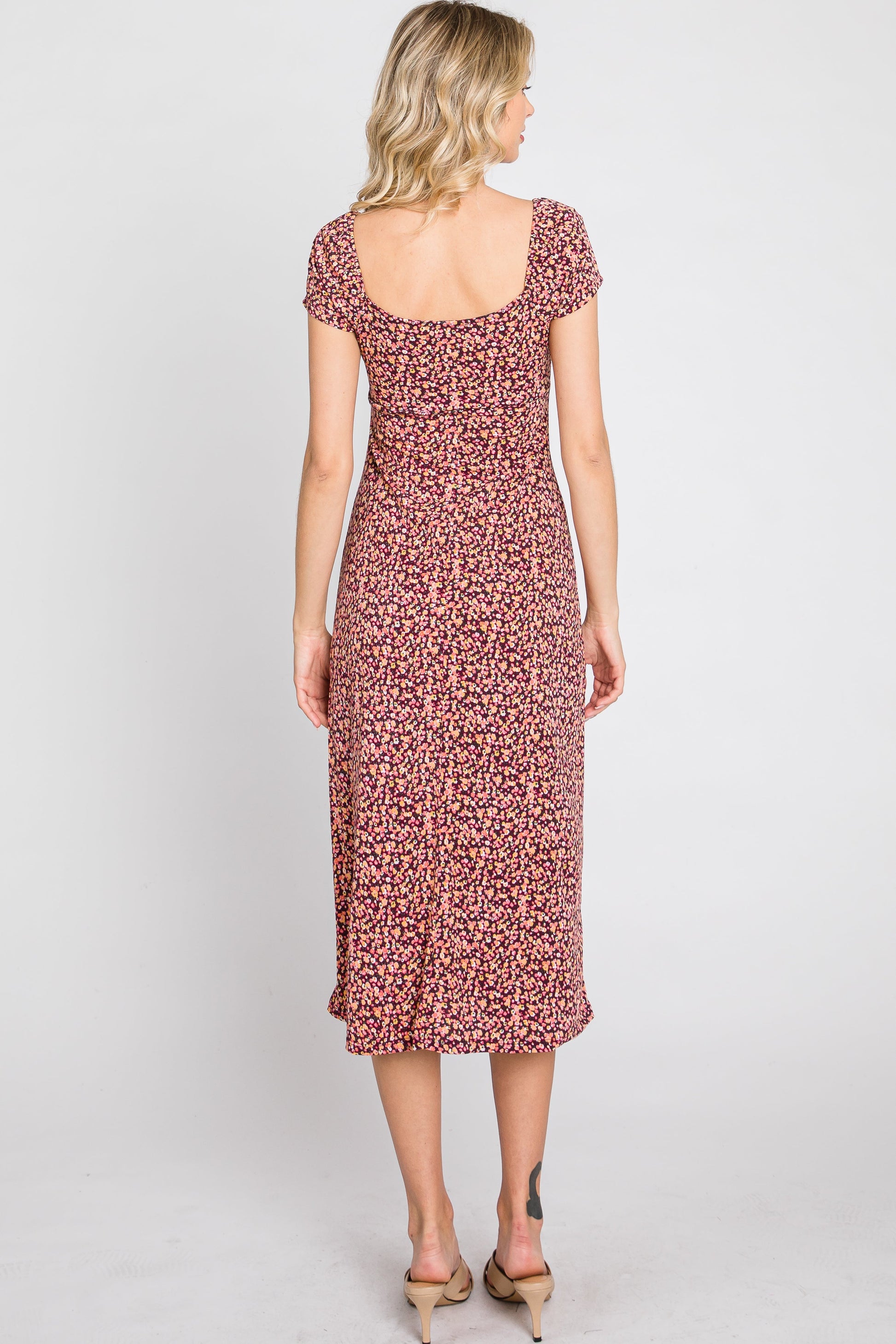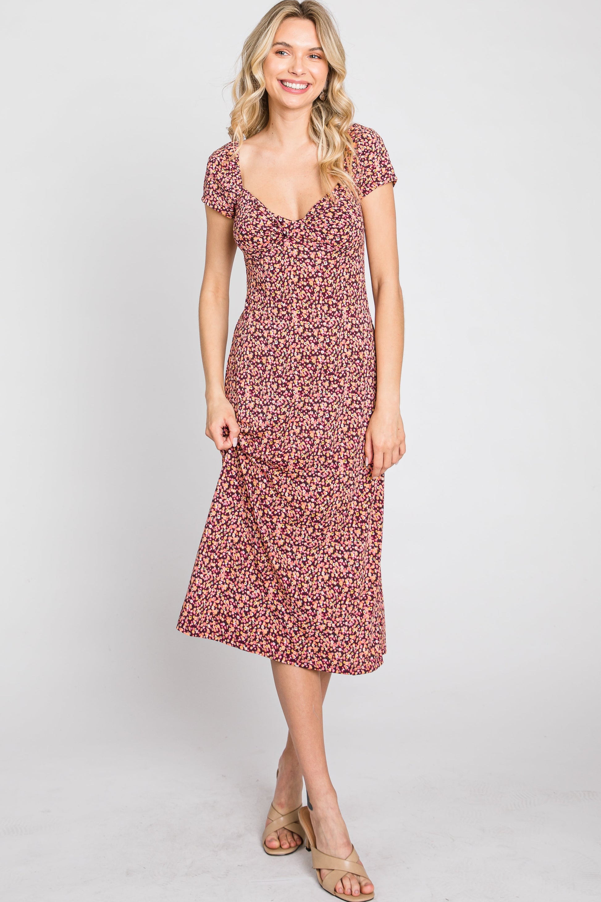 A floral midi dress with a sweetheart neckline and short sleeves.