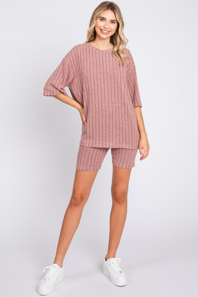 Mauve Ribbed Soft Short Sleeve Shorts Set