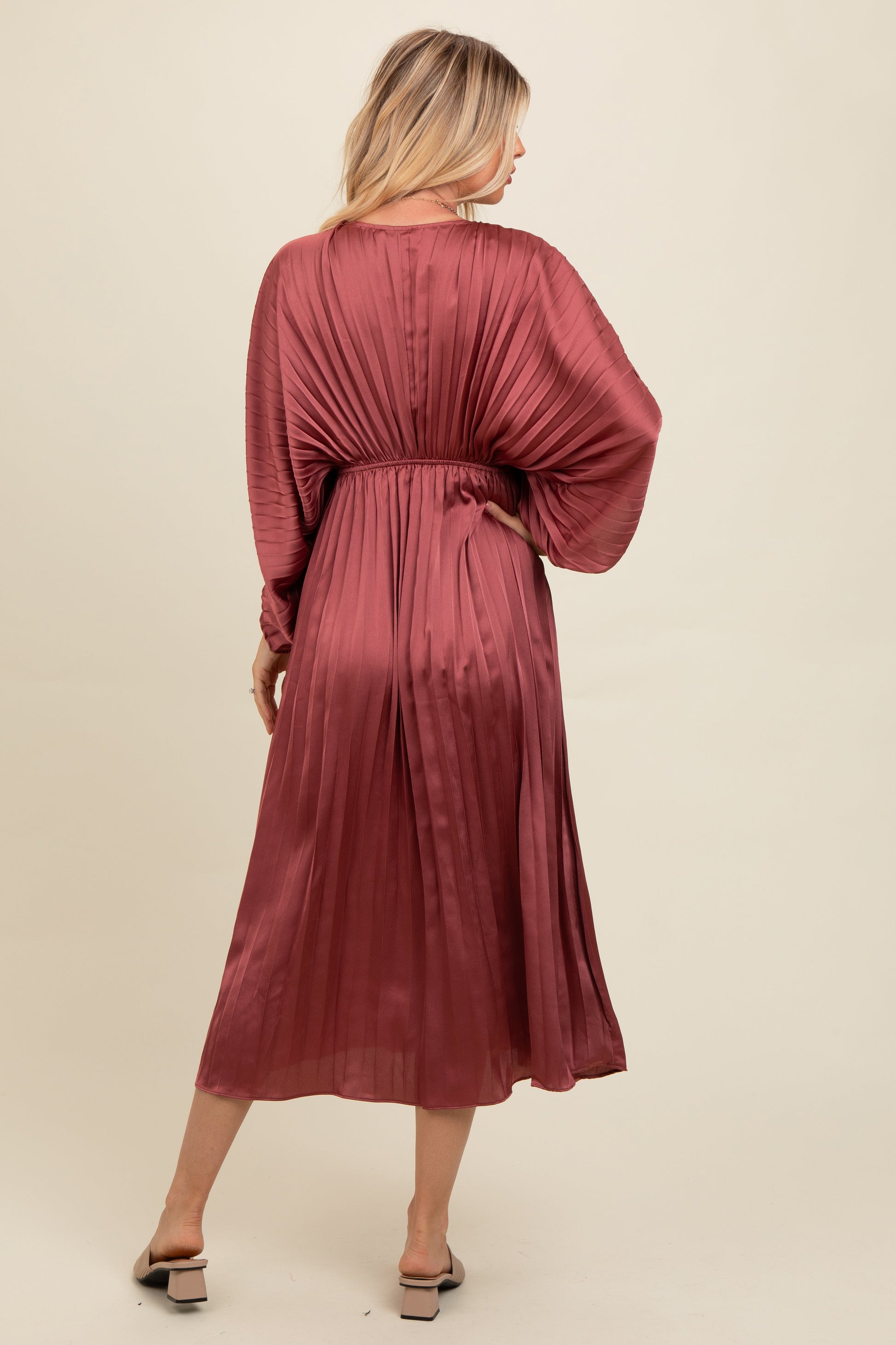 Elevate your wardrobe with this stunning Mauve Satin Pleated V-Neck Maxi Dress. Crafted from luxuriously smooth satin, it features elegant pleats that flow gracefully from the cinched waist, creating a flattering silhouette. The deep V-neckline and relaxed batwing sleeves add a touch of sophistication and comfort, making this dress perfect for both special occasions and stylish everyday wear. The rich mauve hue complements all skin tones, while the midi length ensures versatile styling options. Pair with heels for an evening out or sandals for a chic daytime look. Effortless elegance awaits!