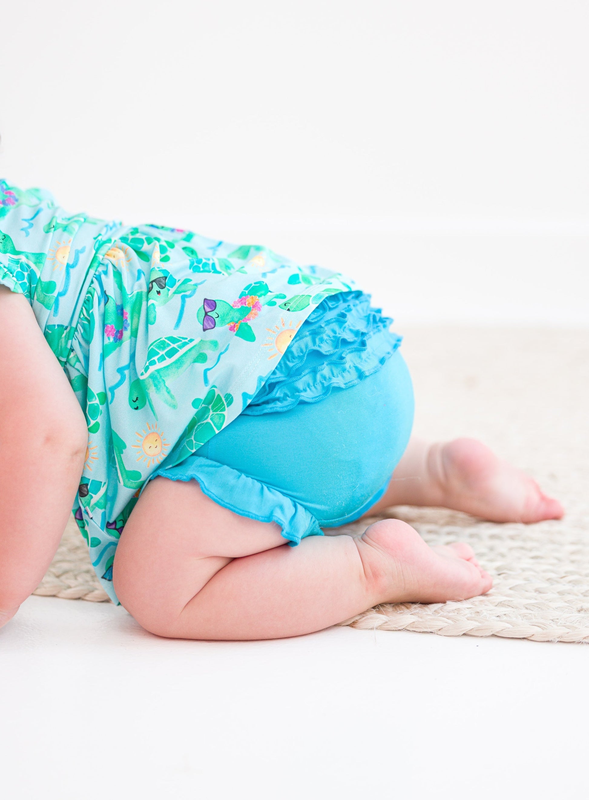 This adorable infant peplum set brings all the sunshine and sea turtle cuteness your little one needs! Featuring a flutter-sleeve peplum top and matching ruffle bloomers, it's made from our signature buttery-soft bamboo viscose blend—lightweight, breathable, and perfect for sensitive skin. The vibrant print and comfy fit make it ideal for warm days, photo ops, and tropical moments.