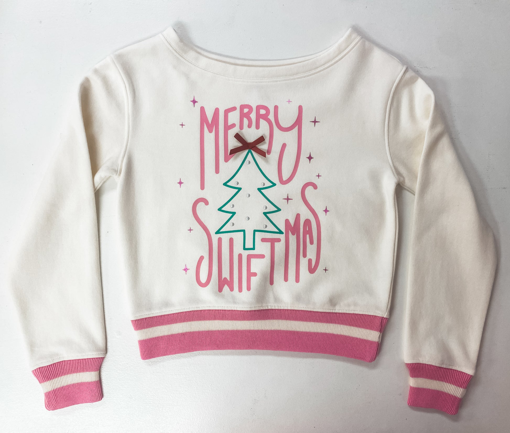 This cozy fleece sweatshirt is designed for tween girls who love festive fashion and fun details. The front features the playful holiday phrase “Merry Swiftmas” in pink with a Christmas tree accent, topped with a red organza bow appliqué and tiny pearl embellishments for extra holiday sparkle. Finished with striped pink-and-white ribbed trim, it’s the perfect blend of cozy comfort and boutique holiday charm.