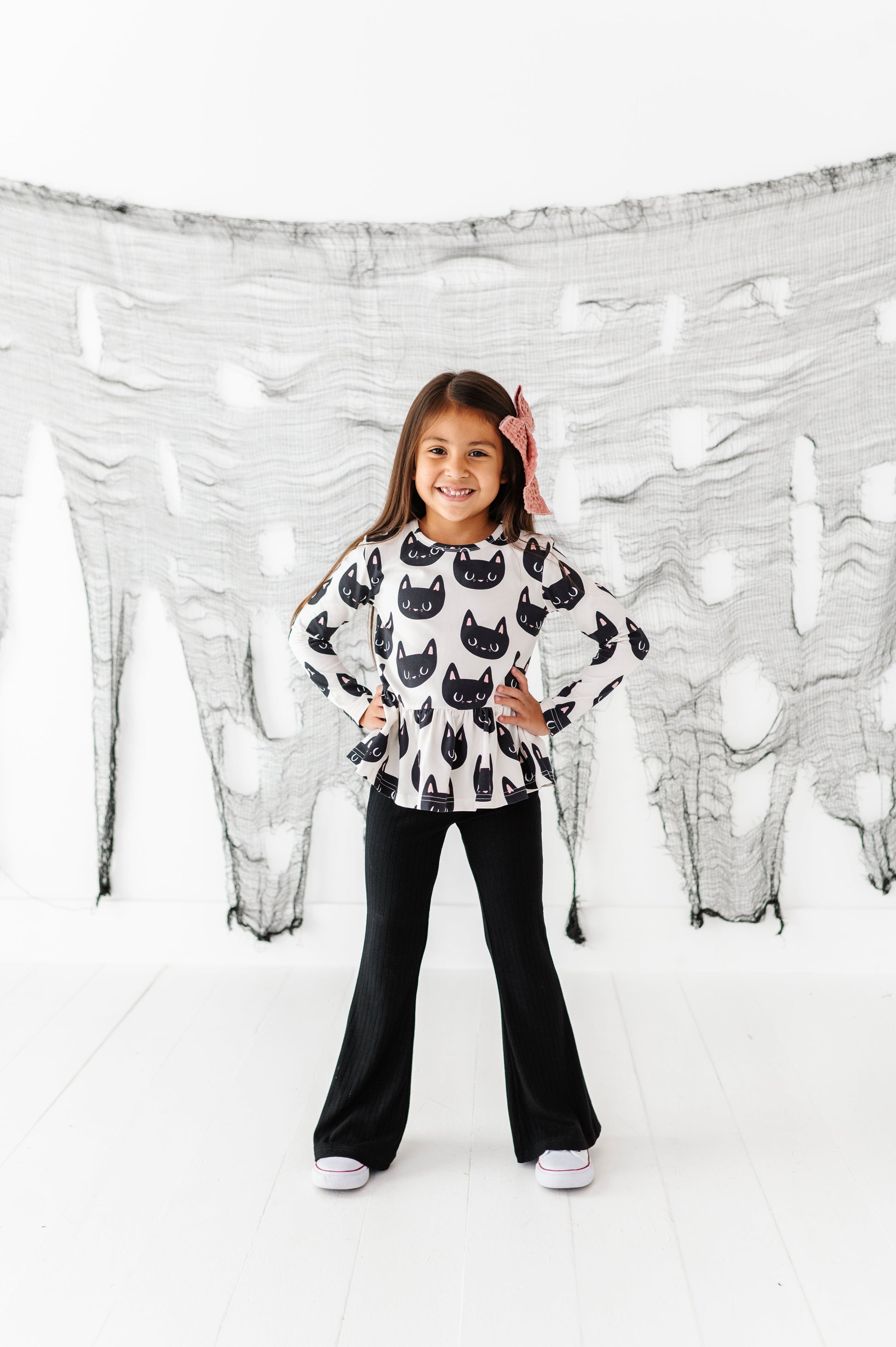 This item runs true to size. These are made to fit snug in the waist/hips and top of legs and then flare at the knee down. If you have a girl with long legs we recommend ordering the size she needs for pant length! If you have a shorter girl we don't recommend sizing up because you don't want flares to drag on the floor :)