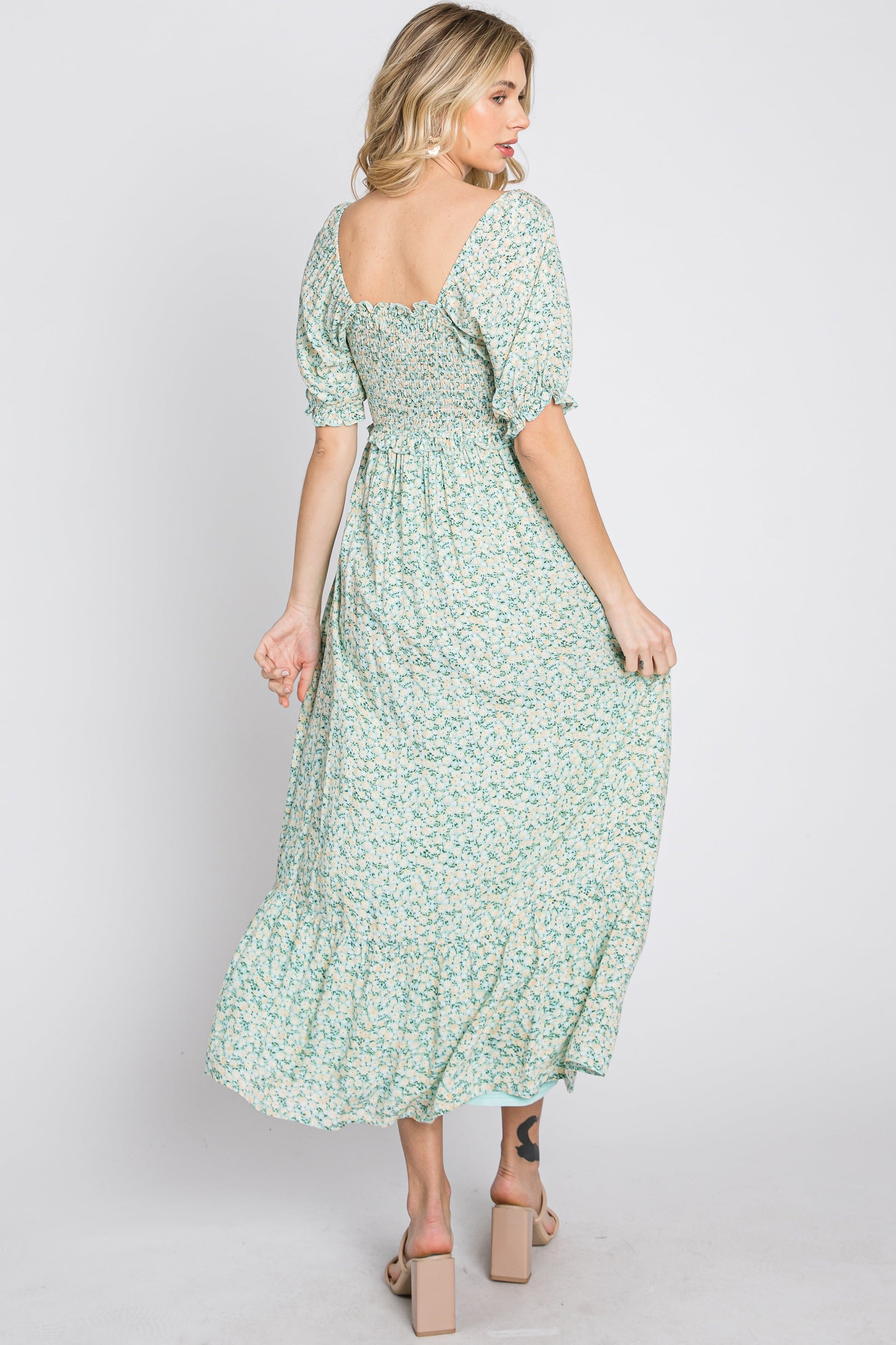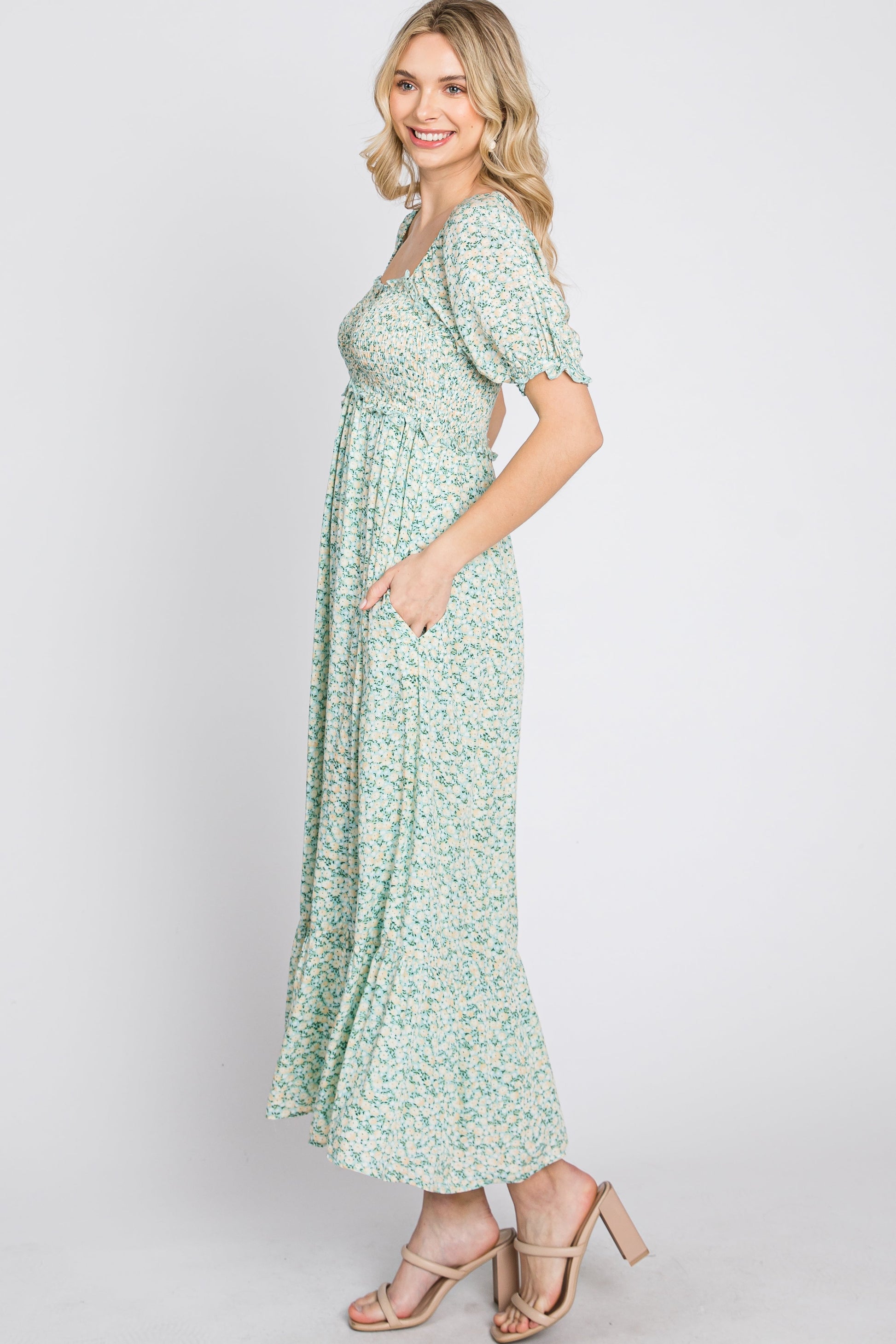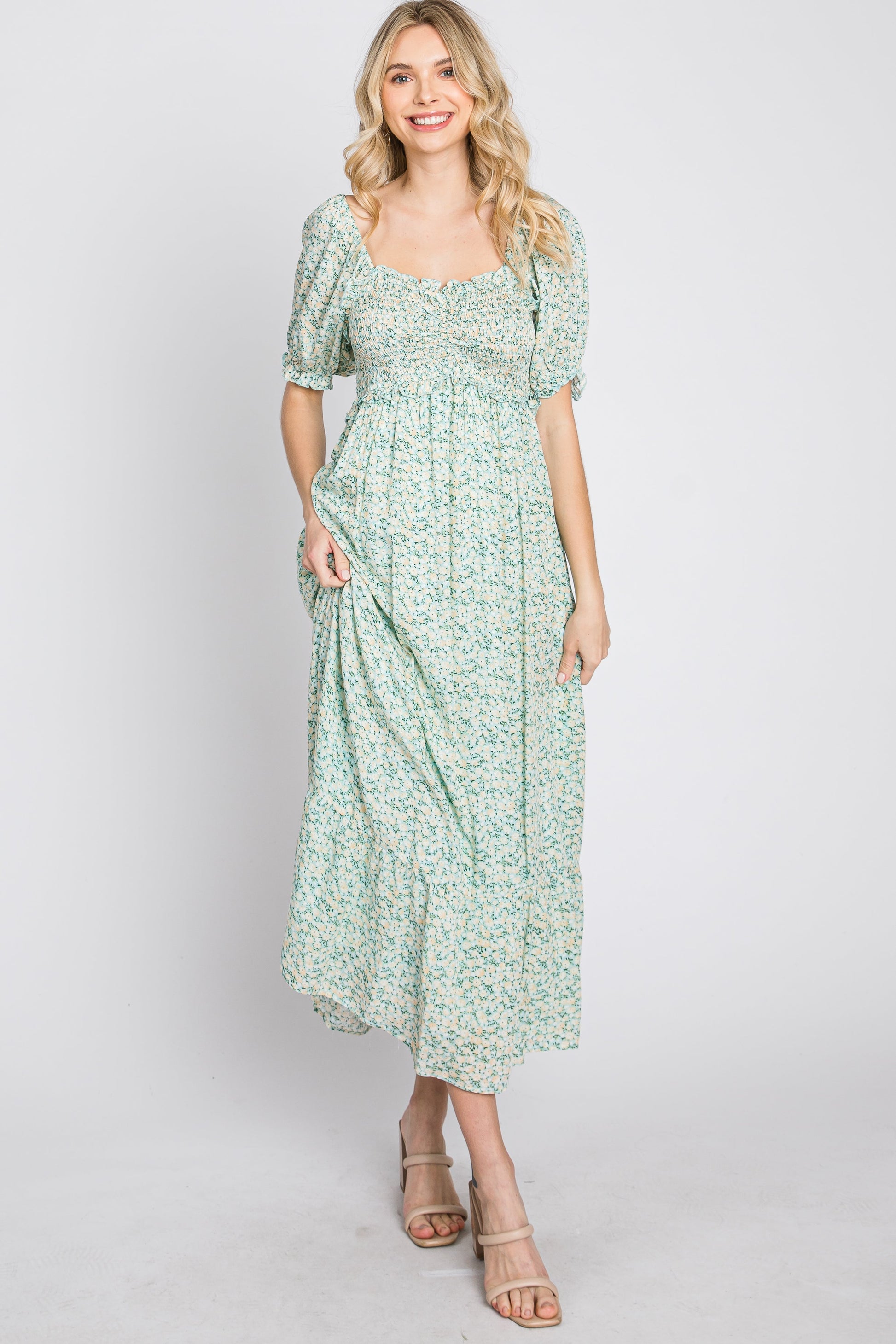 A floral print midi dress featuring a sweetheart neckline, a smocked top, shot puff sleeves, side pockets and a ruffle hem. Skirt is double lined.
