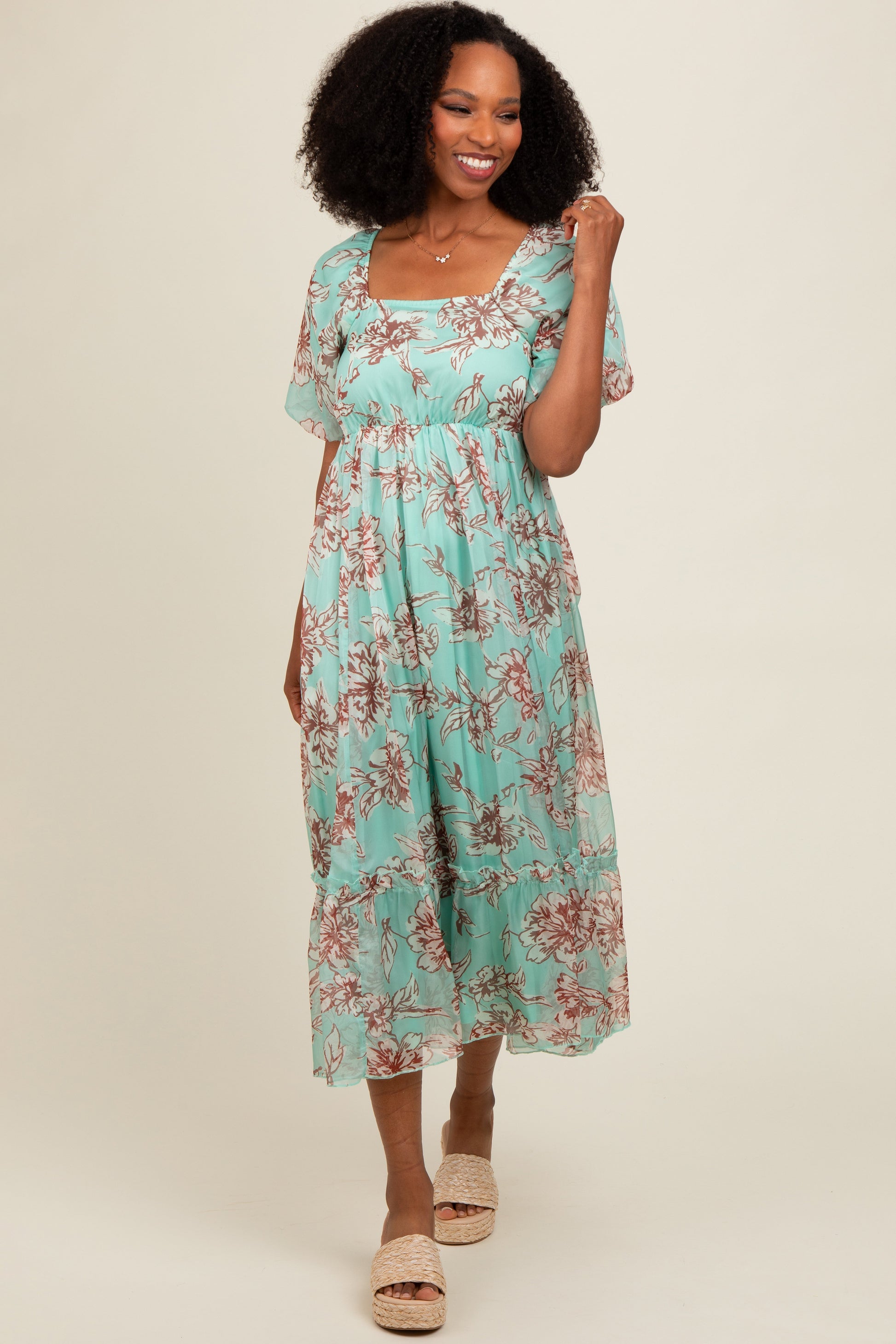 Mint Green Floral Chiffon Ruffle Hem Midi Dress