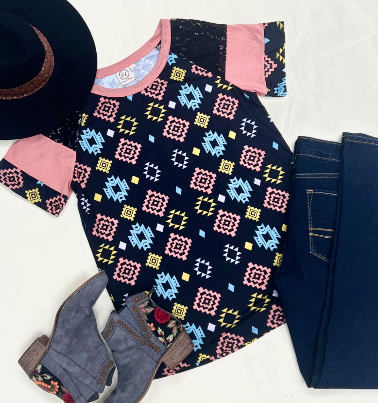 Mint, Pink & Mustard Aztec Lace Top