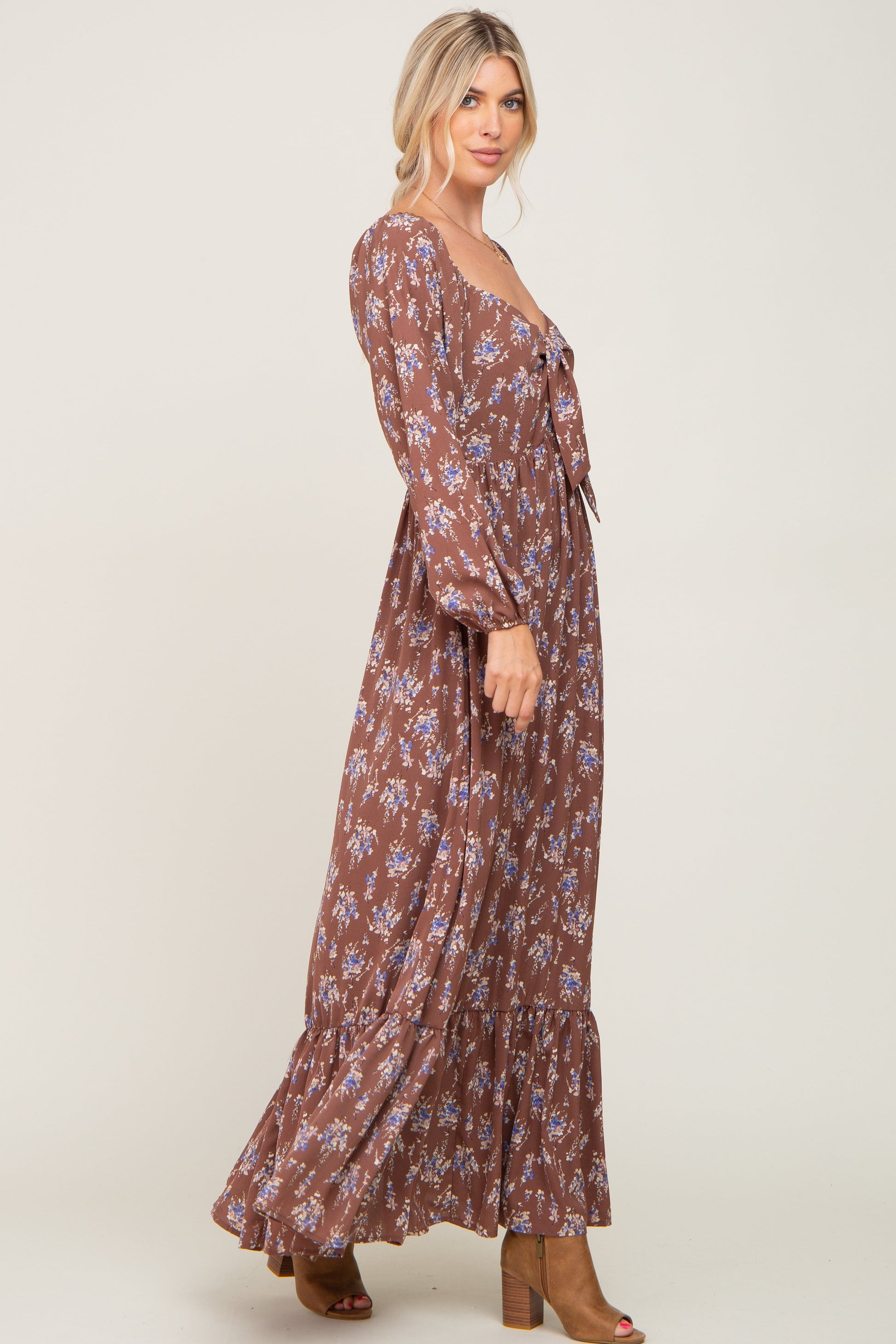 A floral print maxi dress with a sweetheart neckline with tie accent, smocked back, bubble sleeves and ruffle hem. Dress is lined.