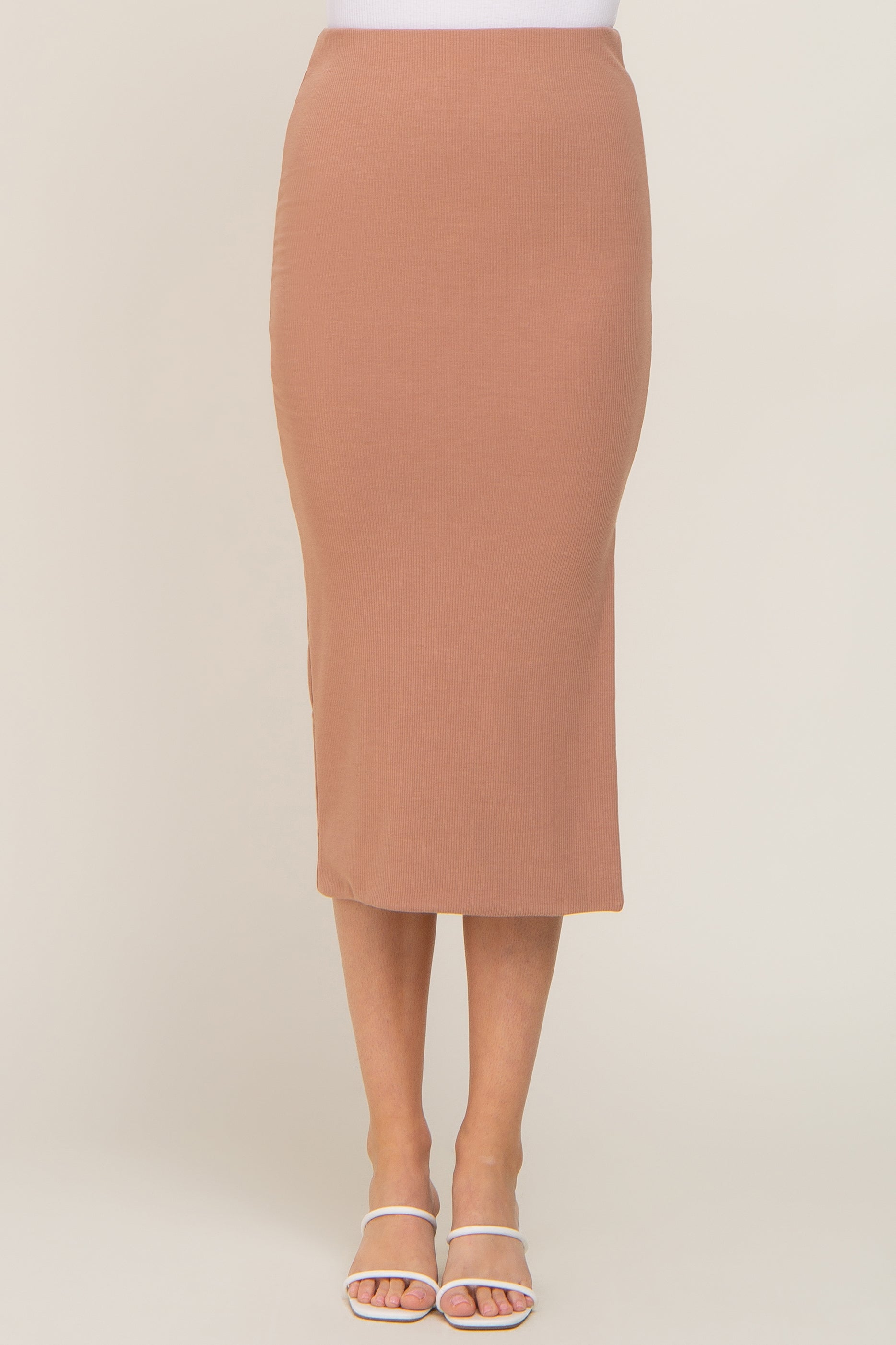 A ribbed knit skirt featuring a side slit and an elastic waistband.