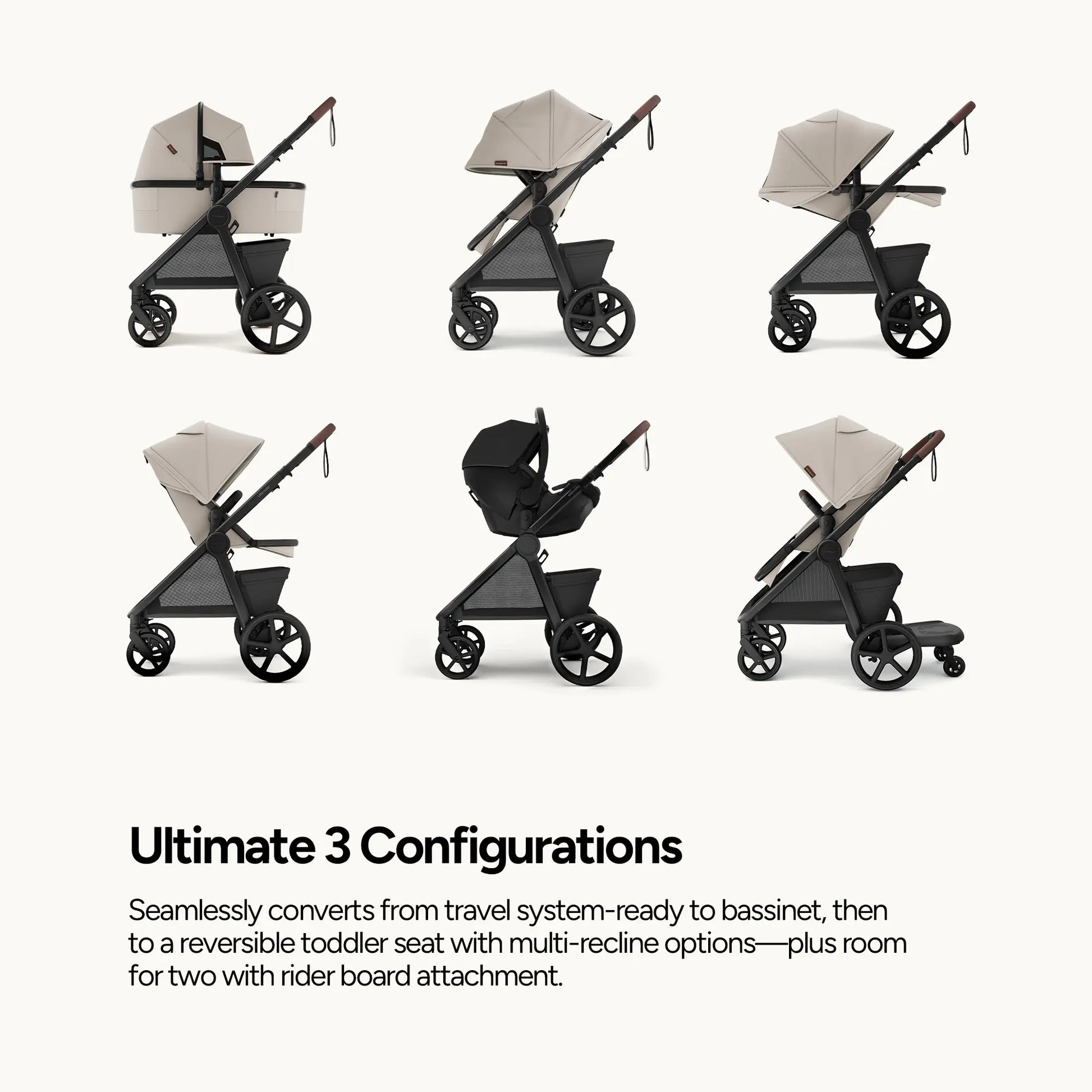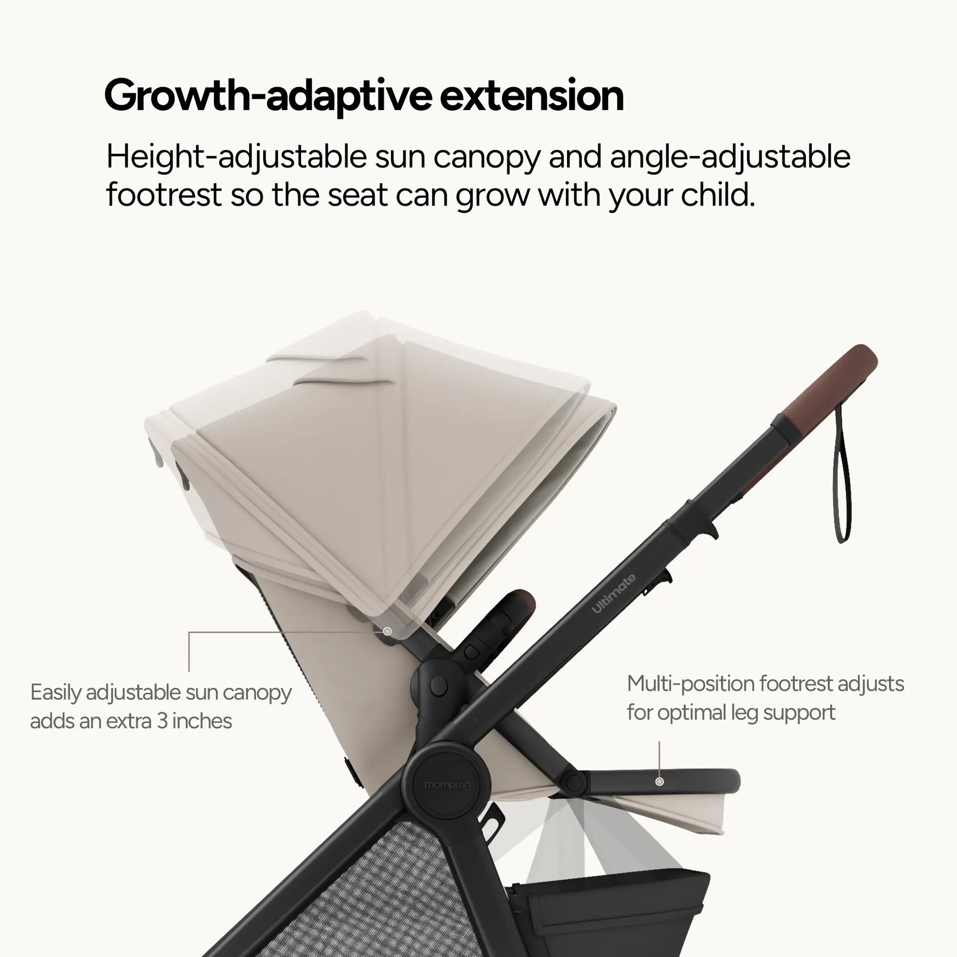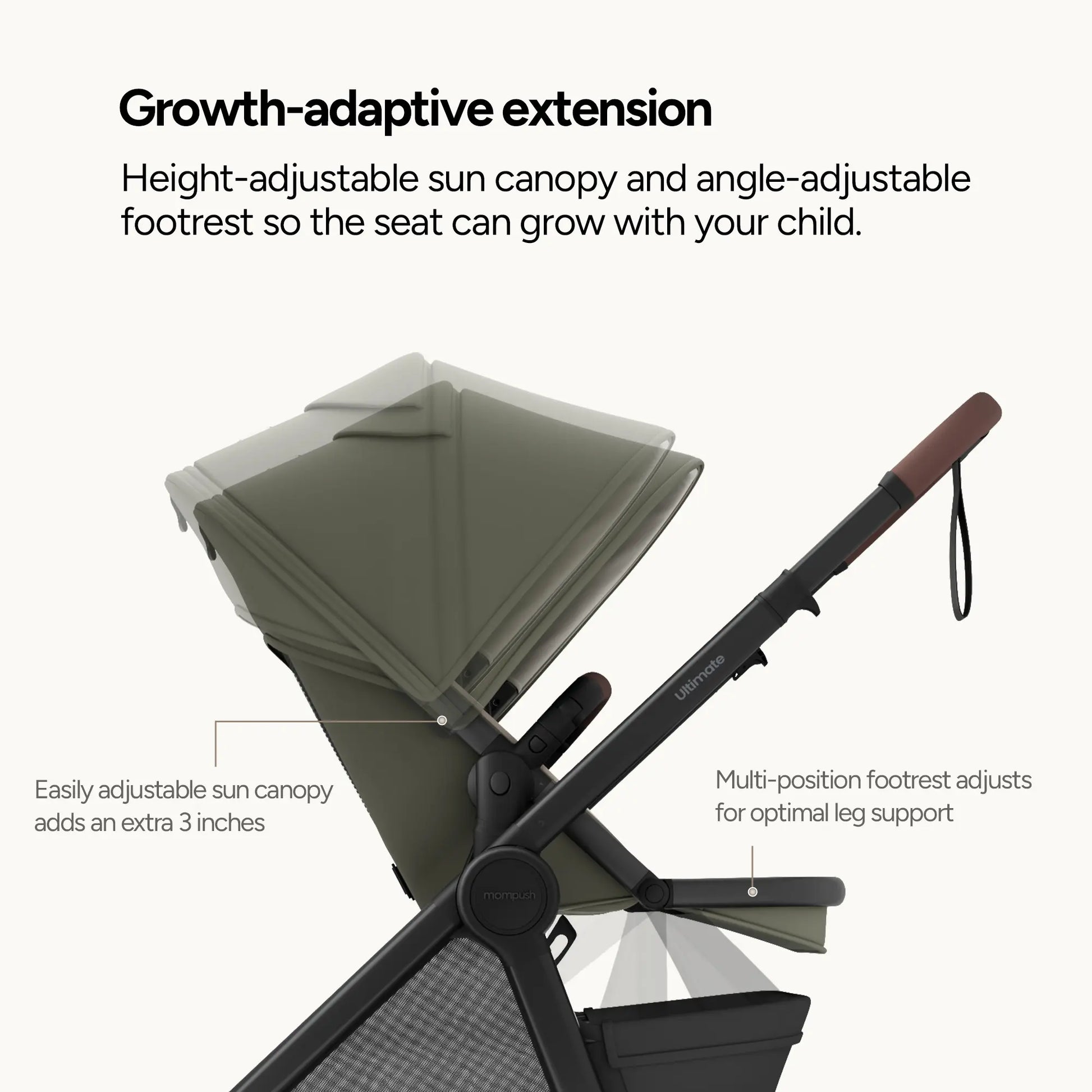Explore boundless joy in effortless comfort, nurturing your child's growth from newborn to toddler. Sustainably versatile, the Mompush Ultimate 3 is engineered for seamless strolls on any terrain.