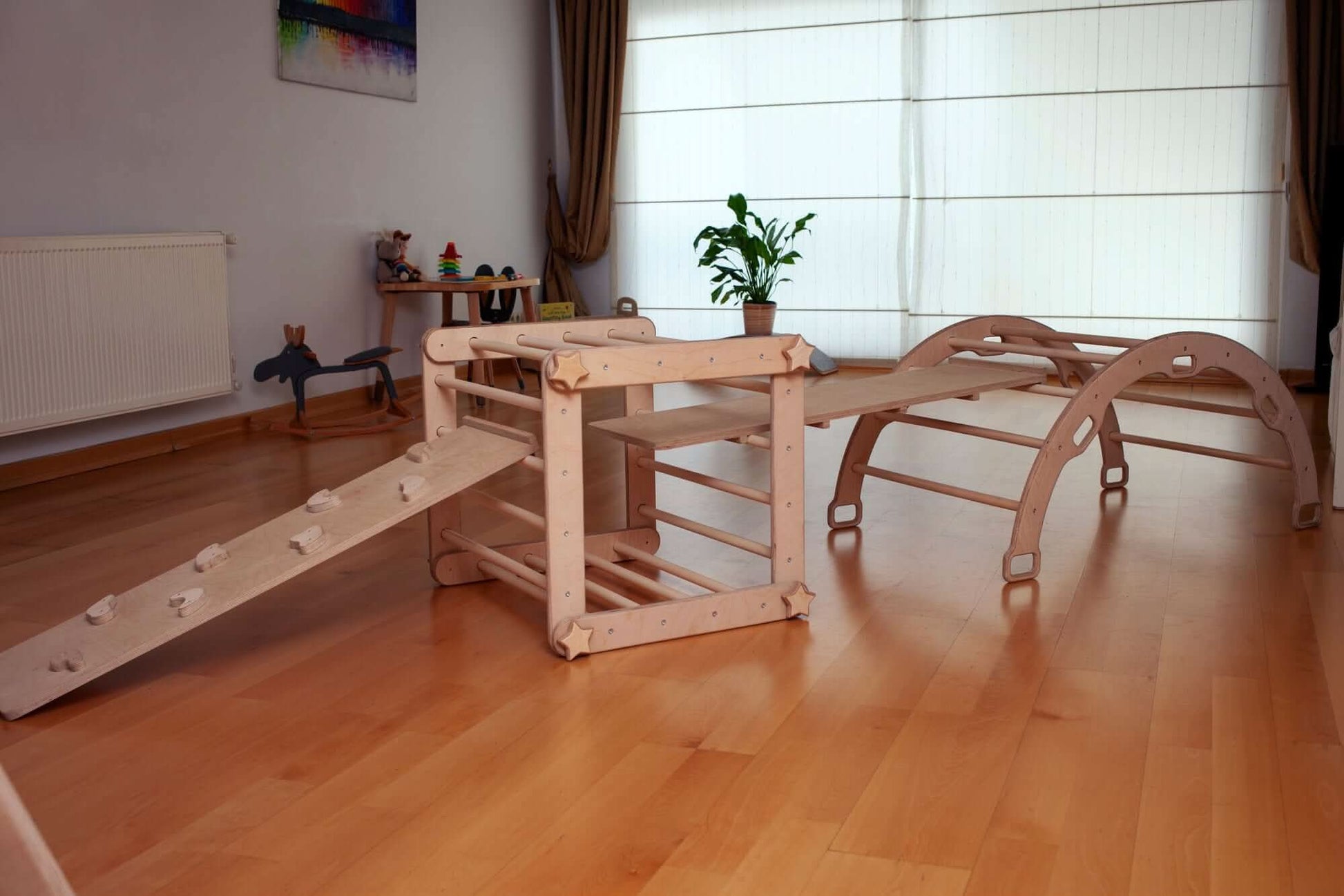 Our Montessori Climber Set (6 pieces) offers a comprehensive solution. This set includes a Climbing Triangle, Climbing Arch, Transformable Cube, Climbing Ramps, and an XL Pillow. Each piece is crafted from the highest quality natural birch plywood and linden tree, ensuring safety, durability, and endless fun.
