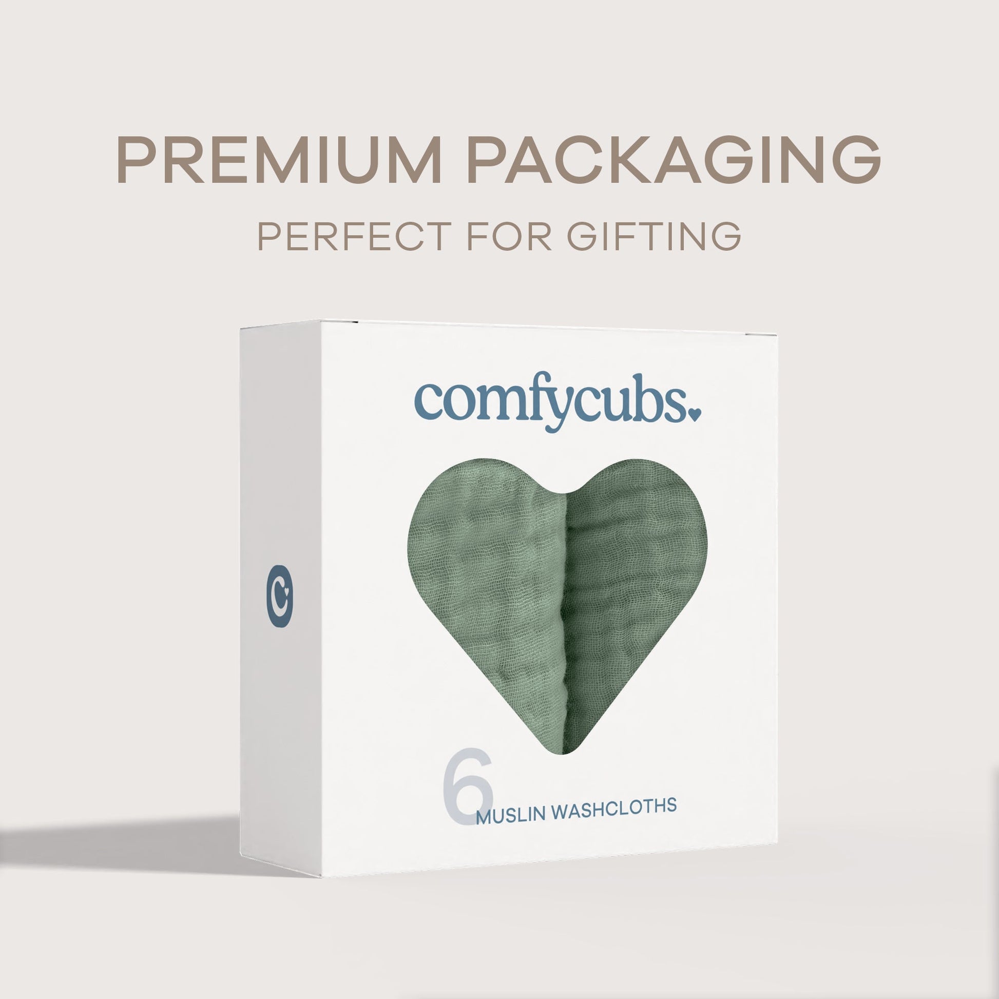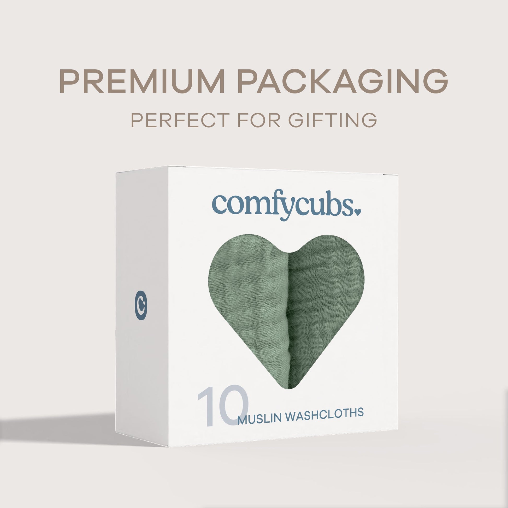 Large Premium 10 X 10 inches Muslin Cotton Washcloths - Comfy Cubs Washcloths are made in a large 10 X 10 inches size and come in a convenient 6 pack or 10 pack.