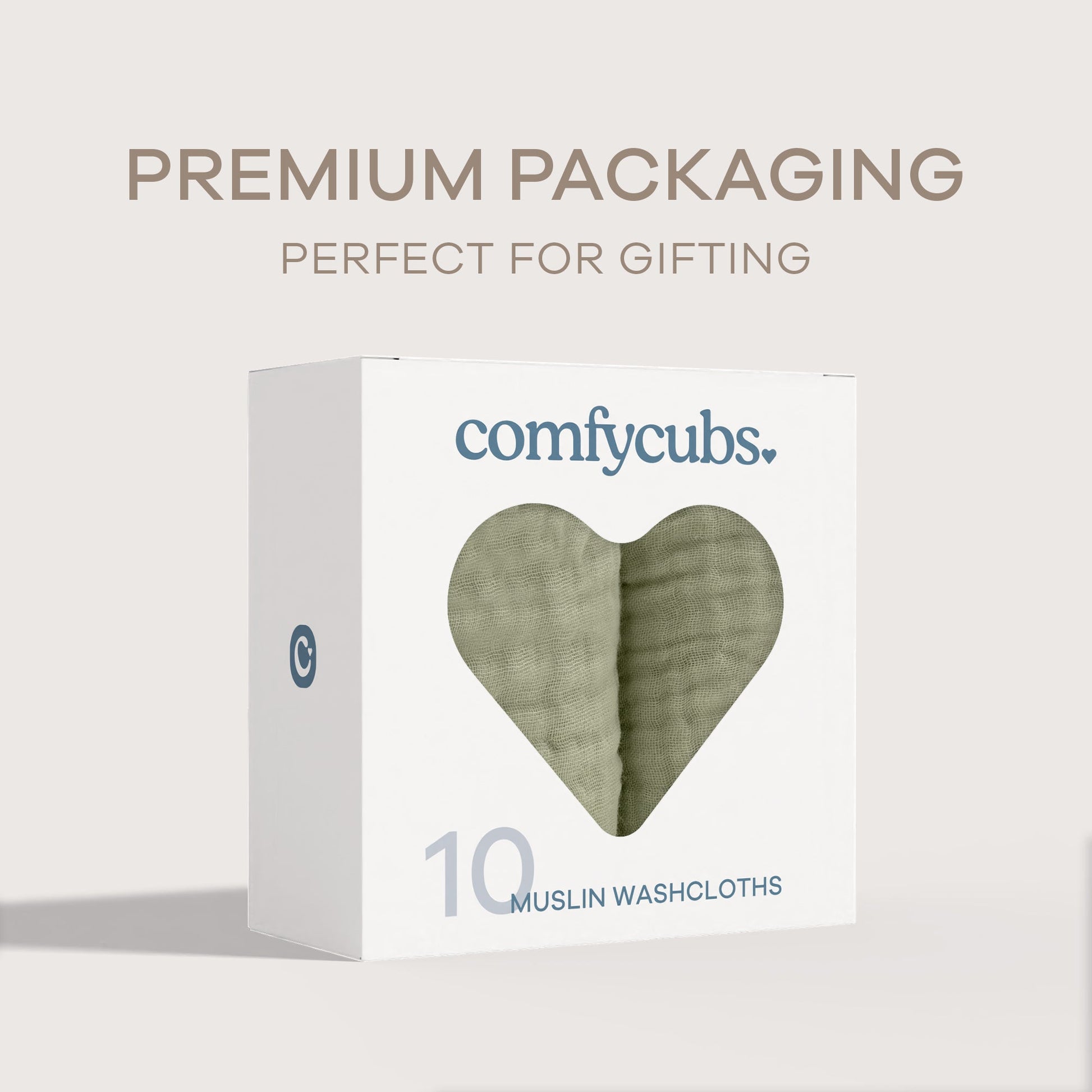 Large Premium 10 X 10 inches Muslin Cotton Washcloths - Comfy Cubs Washcloths are made in a large 10 X 10 inches size and come in a convenient 6 pack or 10 pack.