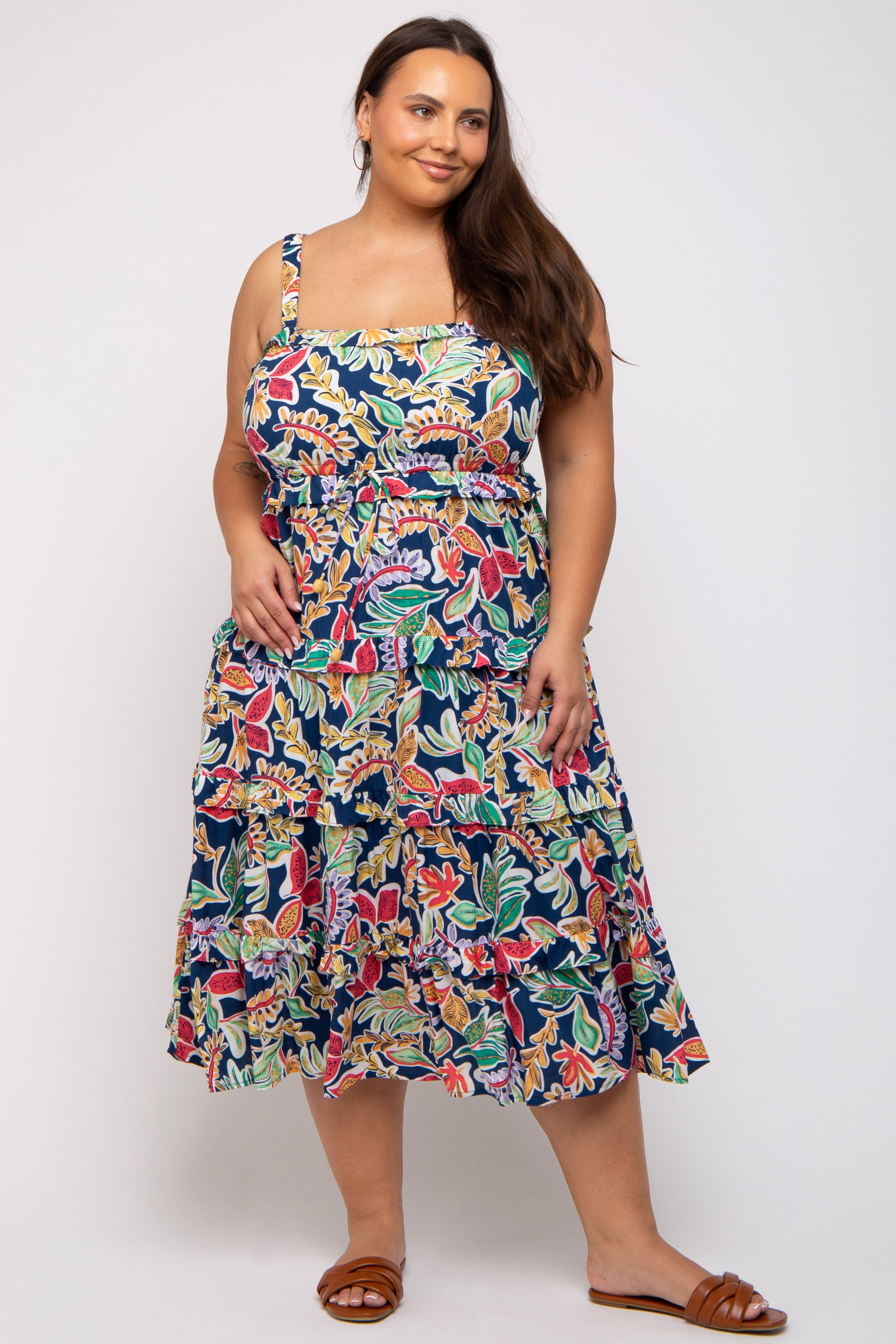 Navy Blue Multi-Color Floral Sleeveless Tiered Plus Midi Dress