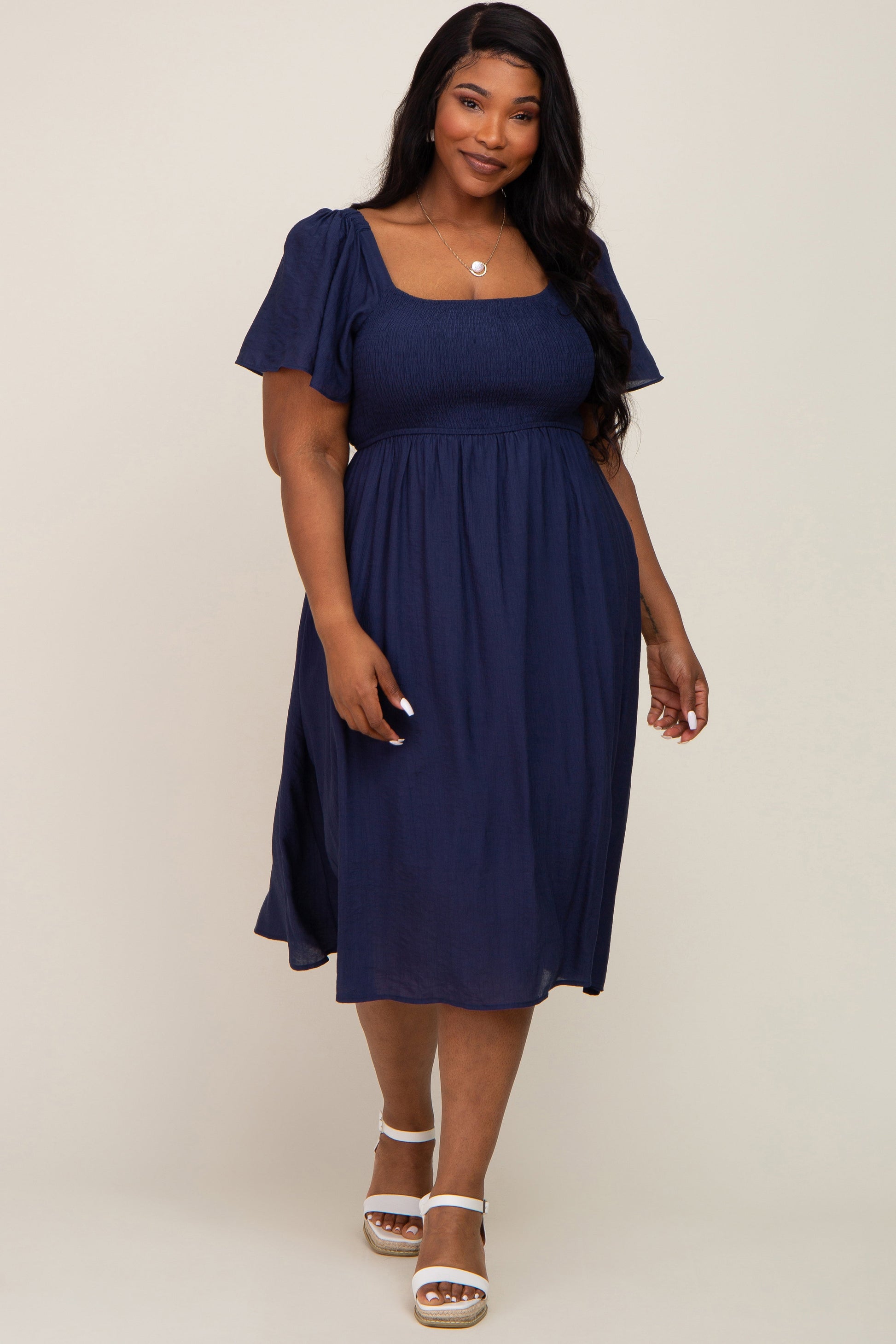 A plus size midi dress featuring a square neckline, short flutter sleeves, a smocked elastic top and double lining.