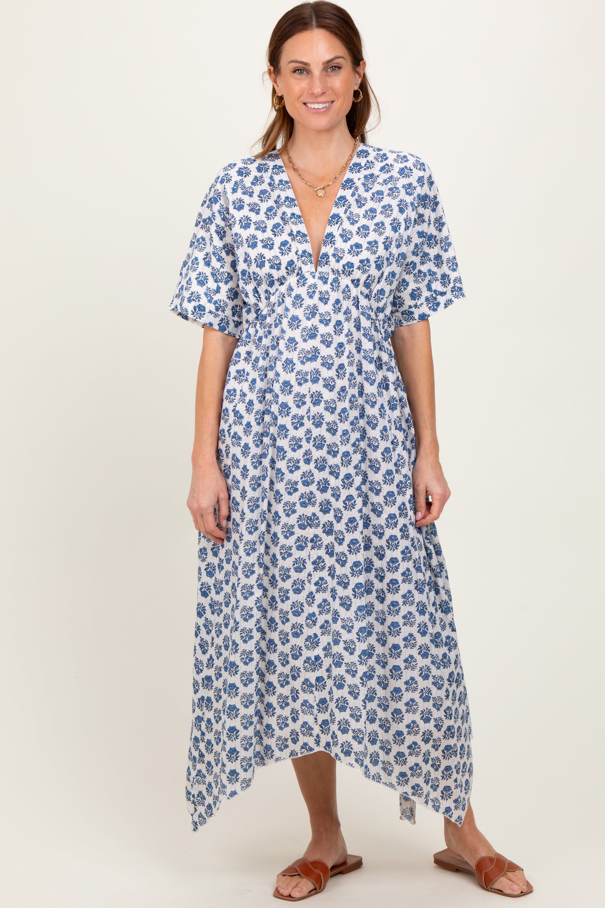 Navy Floral Deep V-Neck Handkerchief Hem Maxi Dress