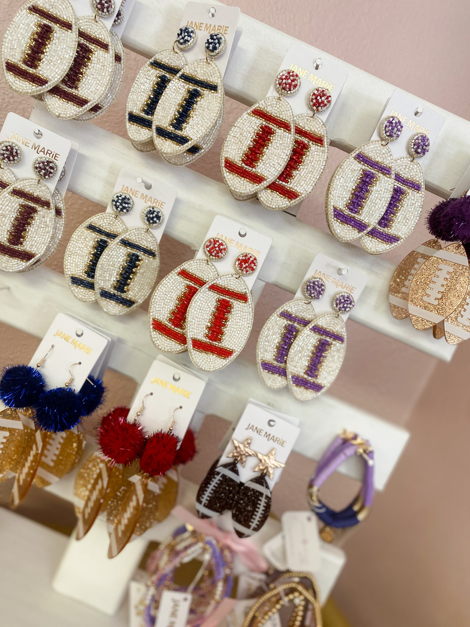 At 3.25” long, they’re a lightweight, eye-catching statement for football fans, cheer moms, and spirit wear lovers who want to add a little glam to game day.