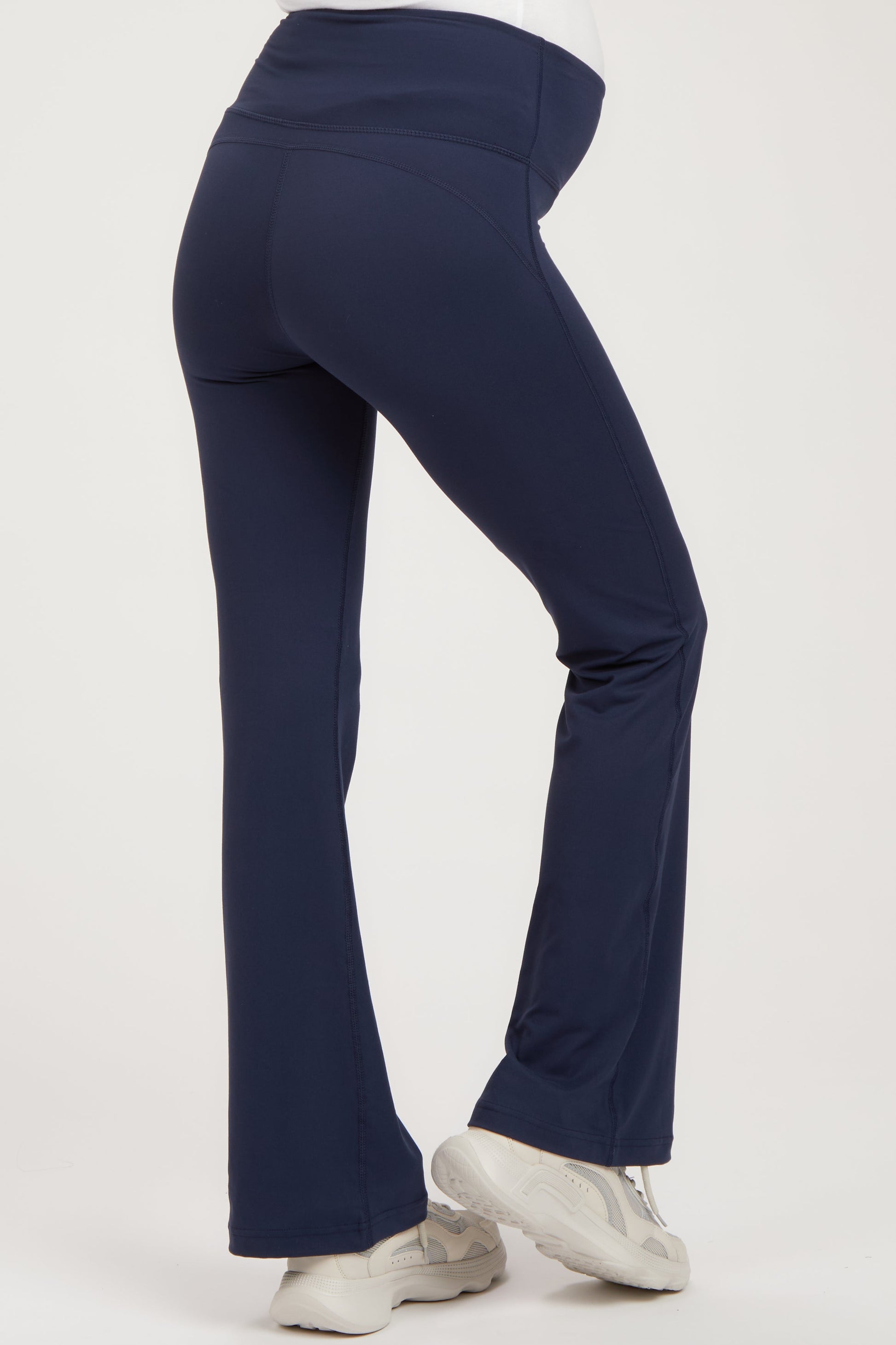 A pair of solid maternity leggings with a flare leg. Includes full pane elastic belly band. Material has high stretch.