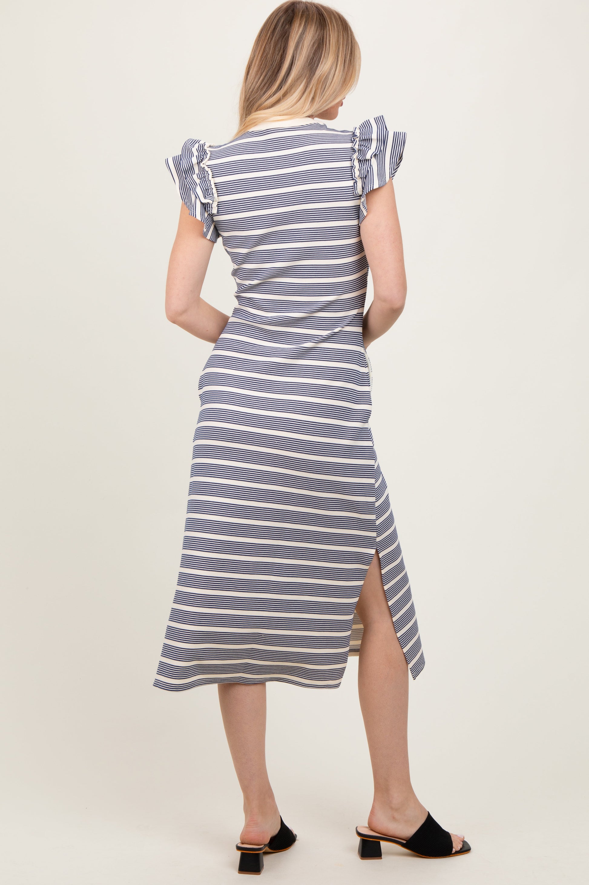 Navy Multi-Striped Button Up Ruffle Sleeve Midi Dress