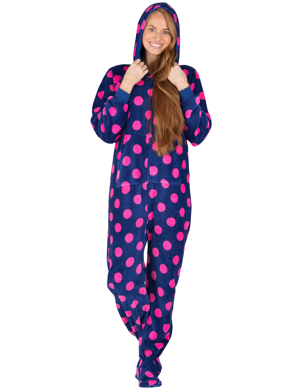 Hot pink polka dots bring bright and stylish effects to these ultra-soft navy blue chenille footie pajamas for women! What better way to sleep than in style and comfort! The hoodie feature makes these jammie gems extra amazing! Superior quality and lasting charm!