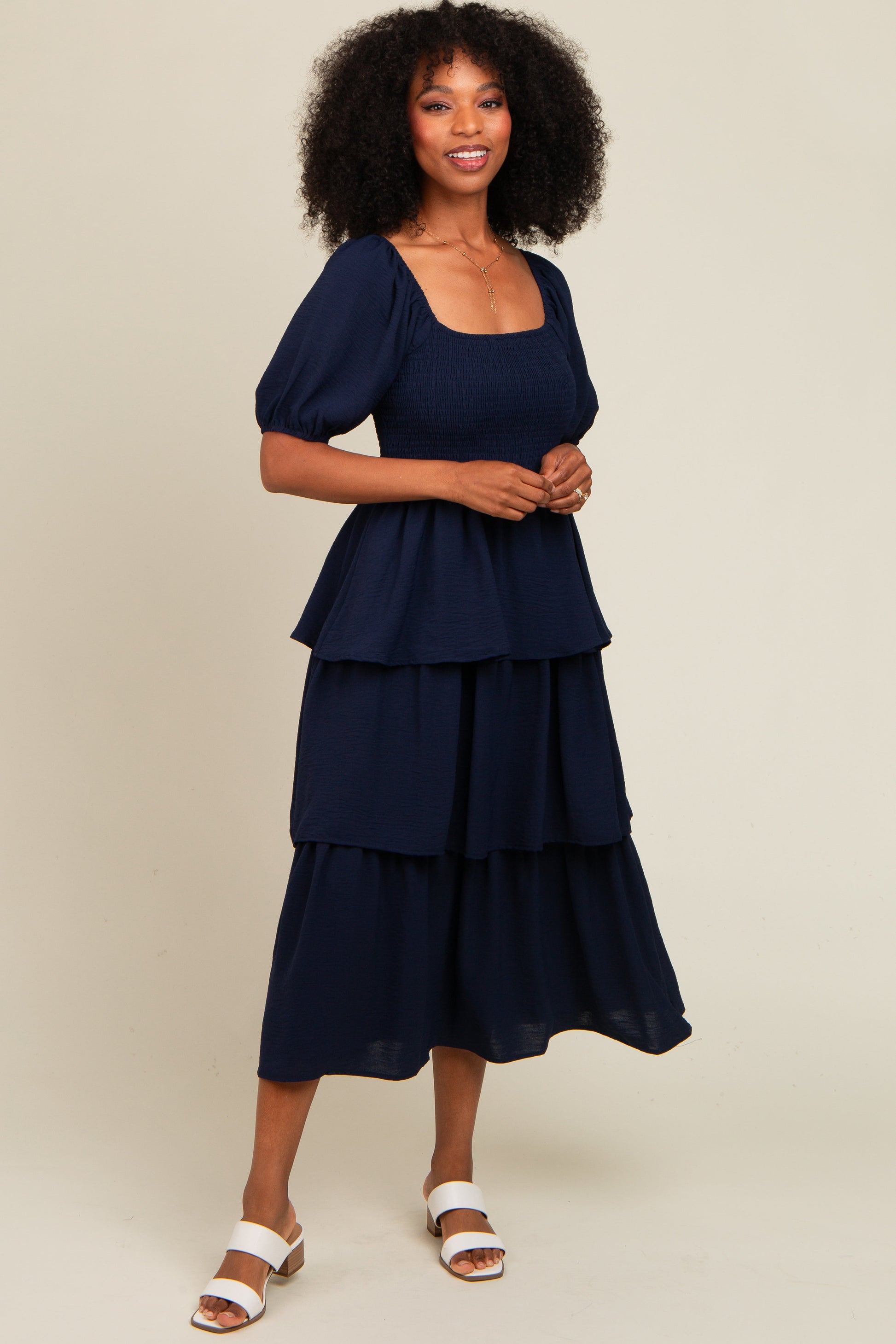 Navy Smocked Body Ruffled Tiered Midi Dress