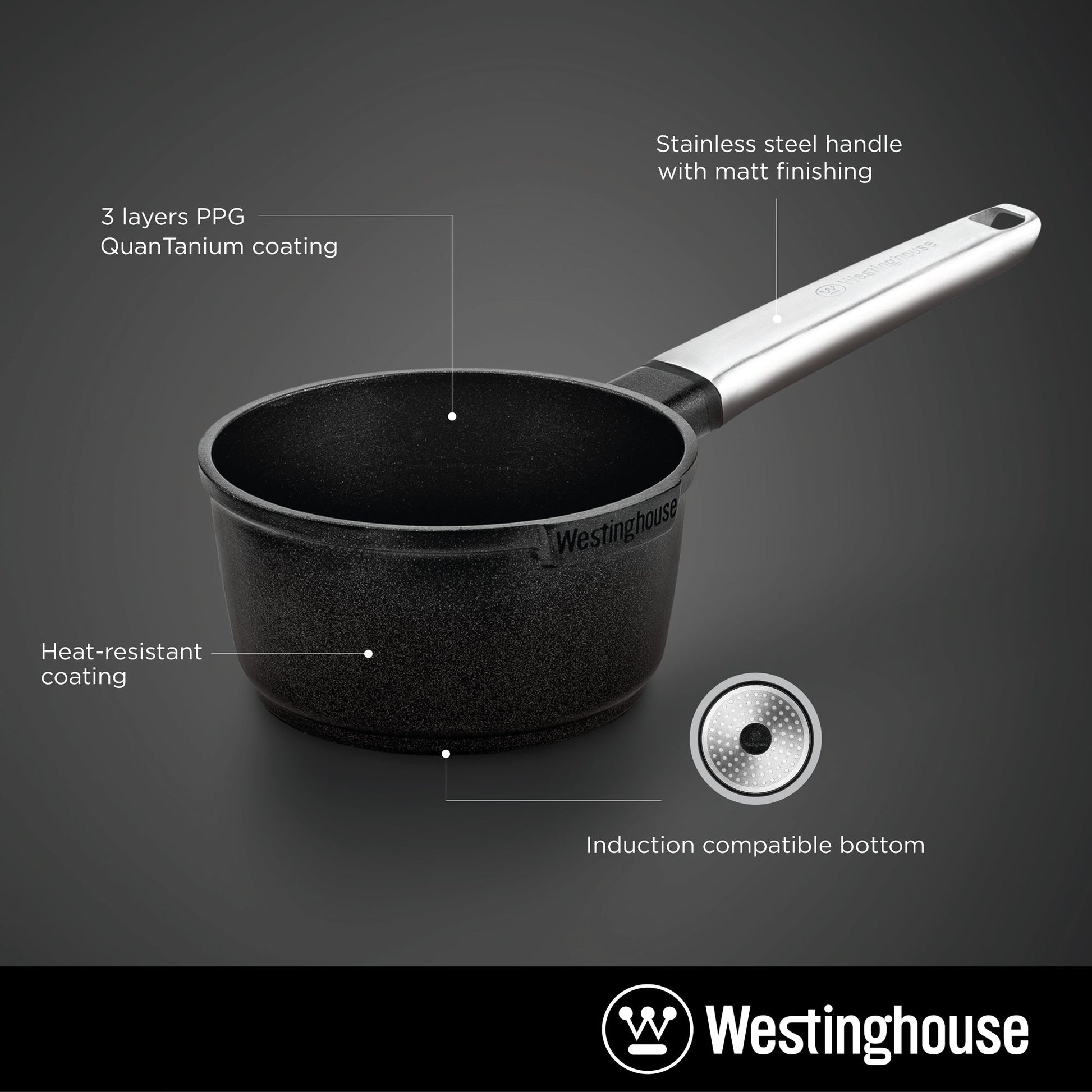 The WESTINGHOUSE 2QT (7") Sauce Pan is built to cook a meal so you will never want to use any other pan. Its made from cast aluminum which is a guarantee that you will own a highly reliable piece of cookware for many years to come. Lighter than cast iron, with a branded non-stick interior for easy clean ups, our cast aluminum sauce pans are made especially for those who like to buy true quality. Versatile enough to cook soups, fry meats, stir fry and more, plus serve them all-in-one straight from your cooker to your table. Usable on any heat source such as gas, electric and even induction. The superior Quantanium triple layered non-stick coating by Whitford, provides maximum food release and the rapid, superior heat conduction no matter what youre cooking. This sauce pan is dishwasher safe, as well as PFOA, lead, cadmium, and heavy metal free.