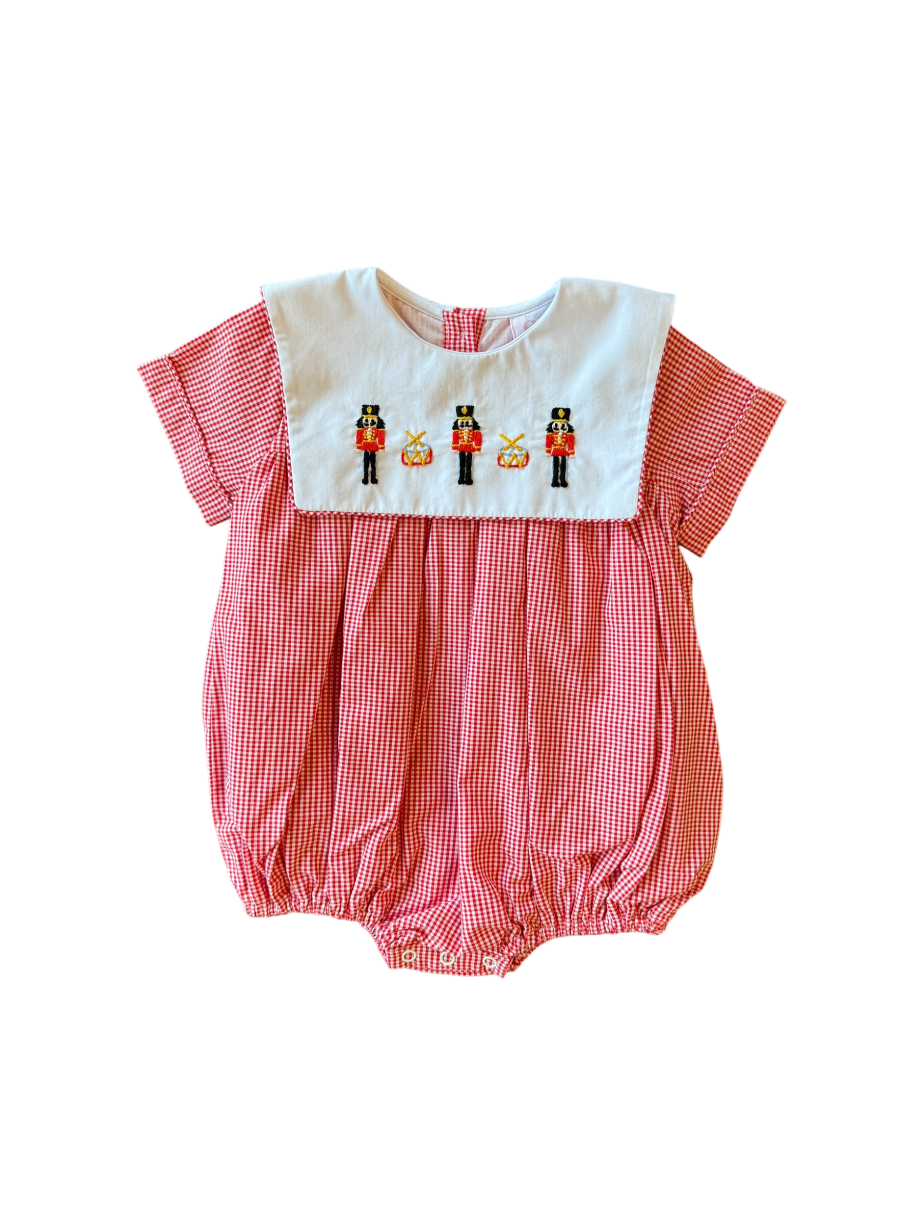 The Nutcracker Barron Bubble is a timeless holiday look for baby boys. Sold at The Prissy Pelican Boutique in Bossier City, Louisiana, this red gingham bubble features a white bib hand-embroidered with toy soldiers and drums. With classic short sleeves, elastic leg openings, and snap closures, it’s perfect for holiday portraits, Christmas services, and festive southern celebrations.