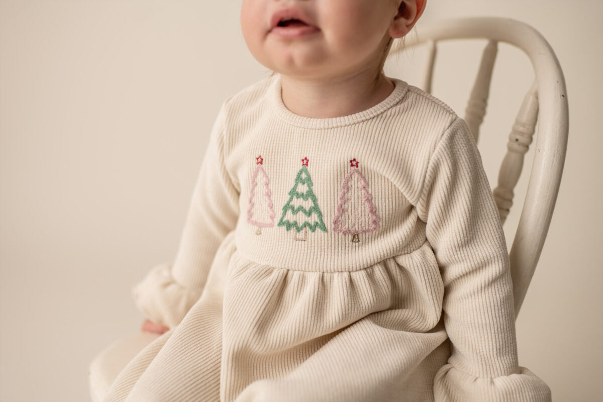 Make holiday memories extra sweet with our O’ Christmas Tree Dress — the perfect mix of classic charm and cozy comfort! Made from soft ribbed knit fabric, this darling cream-colored dress features three embroidered Christmas trees across the chest, complete with little red stars and delicate stitching.