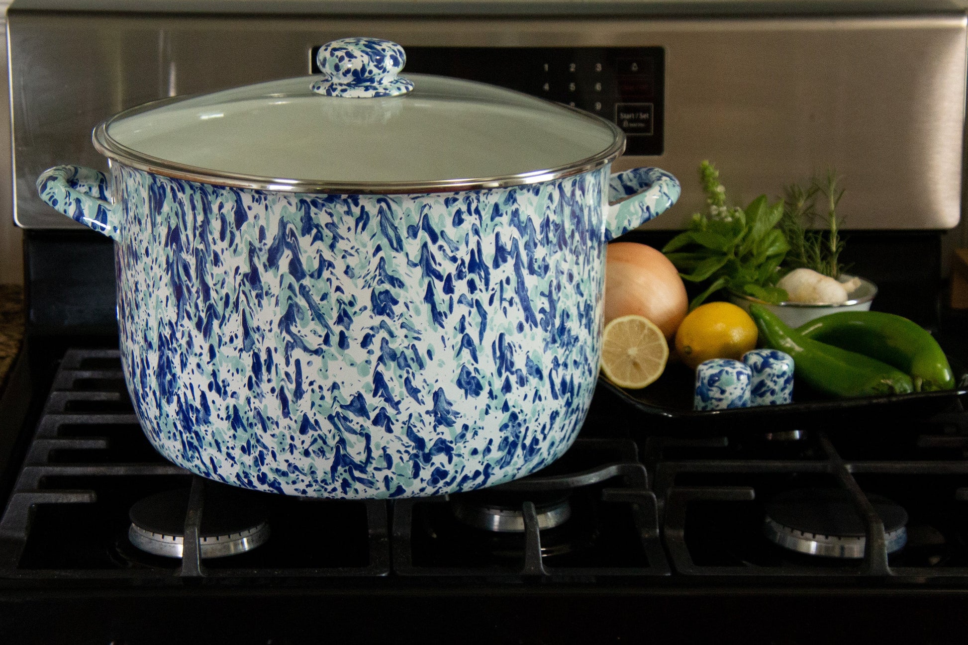 Inspired by the colors of the sea, the Ocean Swirl 18 Qt Stock Pot brings a refreshing, coastal feel to your kitchen. With its beautiful blue and white swirls, this enamelware pot is perfect for preparing large portions of soups, stocks, or seafood boils. Durable and spacious, it’s ideal for family gatherings and hearty meals.